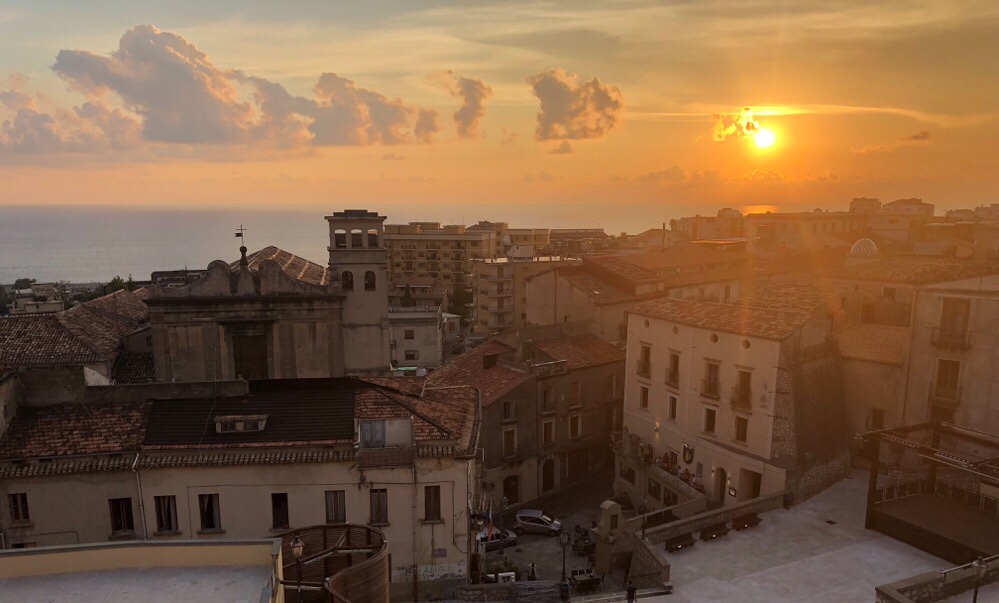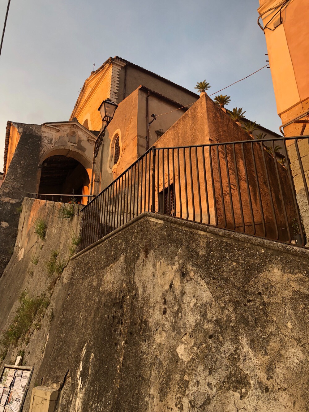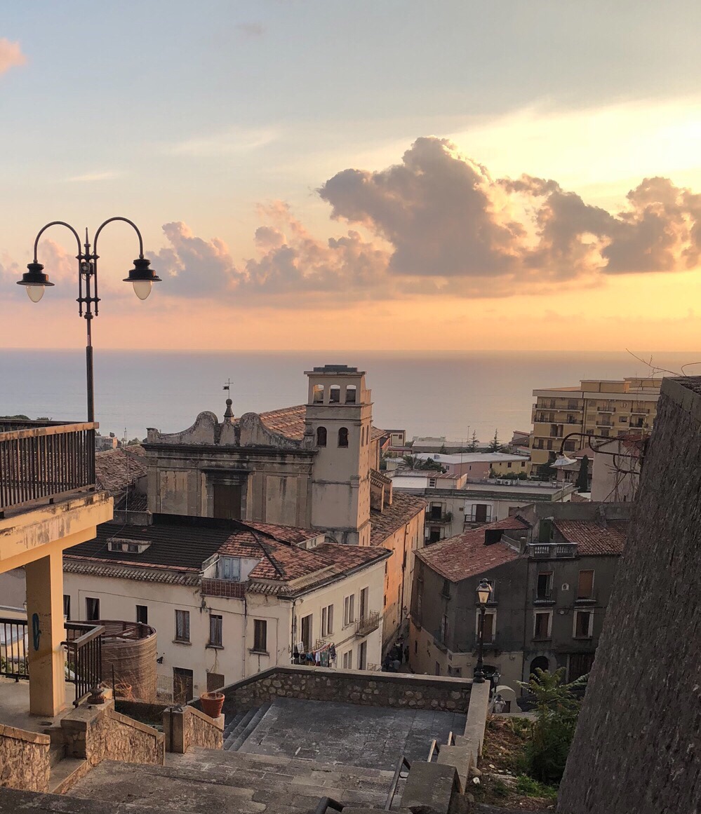 Paola clings to a steep declivity on the western flank of Calabria’s Catena Costiera (coastal chain). Walking through the streets, therefore, often involves navigating long flights of steps and steep inclines. It’s picturesque, though, with narrow streets and a distant view of the sea. The evening sun added some lovely colour to the buildings.