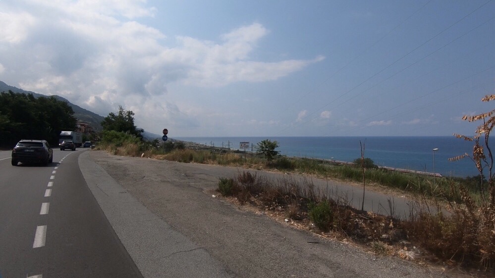 Once down at sea level we alternated between long fast stretches on the SS18 and short slower diversions into nearby villages, in order to avoid the long tunnels on the main road. Our rule of thumb when planning the route is that we must be able to see the far end of the tunnel if we’re going to cycle through it. Google StreetView proves invaluable in this regard, as we can look at the tunnel and assess its viability.