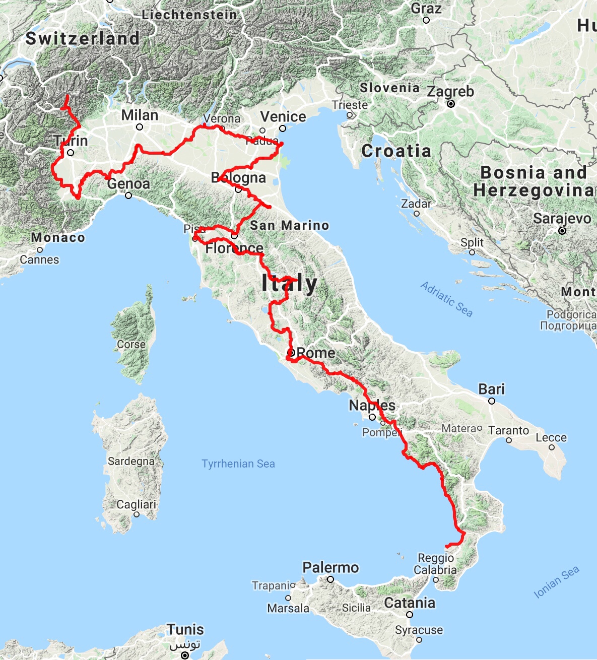 Imagine our surprise when our hotel room turned out to have exactly that view! It’s very new, this hotel, and run by an enthusiastic young couple who visibly relaxed on learning that they could talk to us in Italian! We’ll stay for three nights, setting off again on Tuesday with just two days’ riding to the ferry for Sicily. It’s starting to feel really close now!