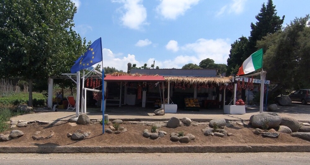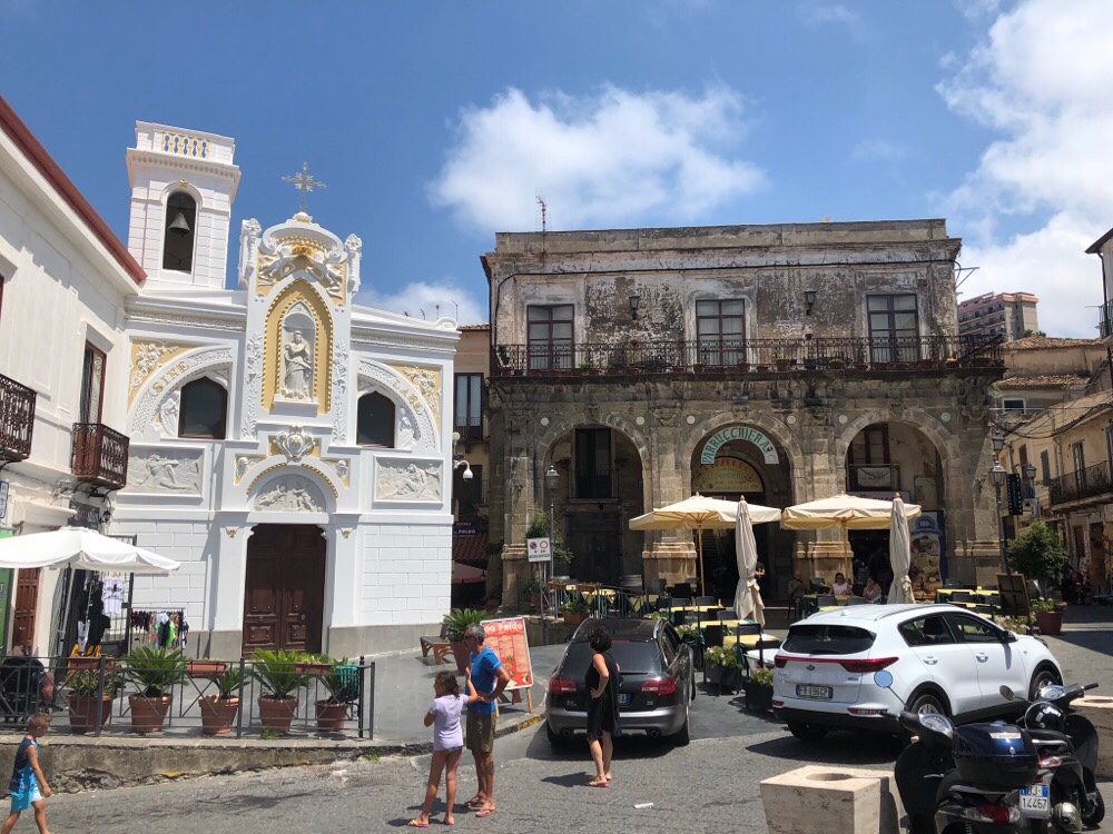 Along the side of the road we saw lots of fruit and vegetable stalls. That’s been a constant feature of the trip so far, but the produce has changed enormously as we’ve come south. Initially there would be apples, plums, courgettes, tomatoes, then there was a period of enormous watermelons. We knew we were properly in the south when we started to see strings of chillis, and then nearing Tropea clusters of the sweet red onions it’s known for.