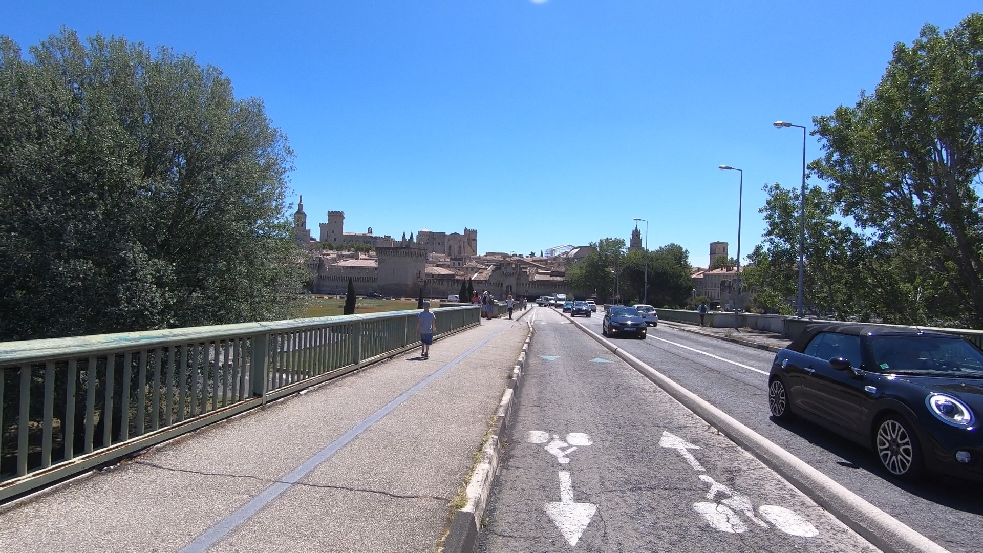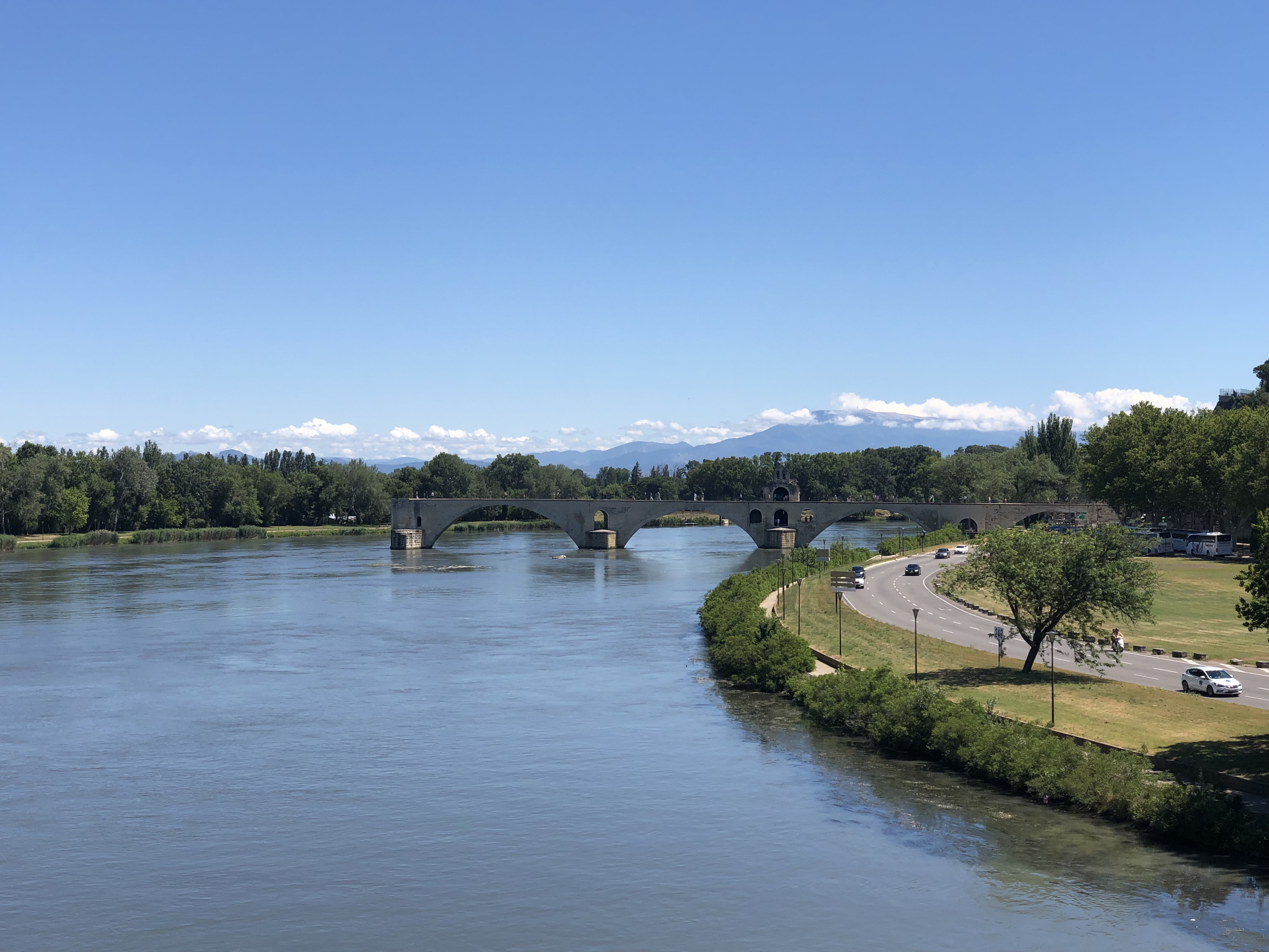 Unusually our navigation through the streets of Avignon went flawlessly, and soon we were stopping on the road bridge to admire the views of the Pont, of Mont Ventoux, brooding in the background and of the Palace of the Popes, back across the bridge.