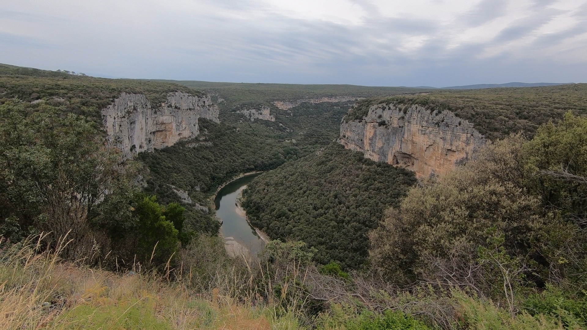 Along the cliff-top there were eleven belvederes or balcons – places where we could stop, rest our legs and admire the view. The earliest of these had views back to Aiguèzes and Saint Martin d’Ardèche. The “bon-père” at Châteauneuf-du-Pape had advised us to make sure we looked back down towards the east at each of the belvederes, as this direction offered the better views.