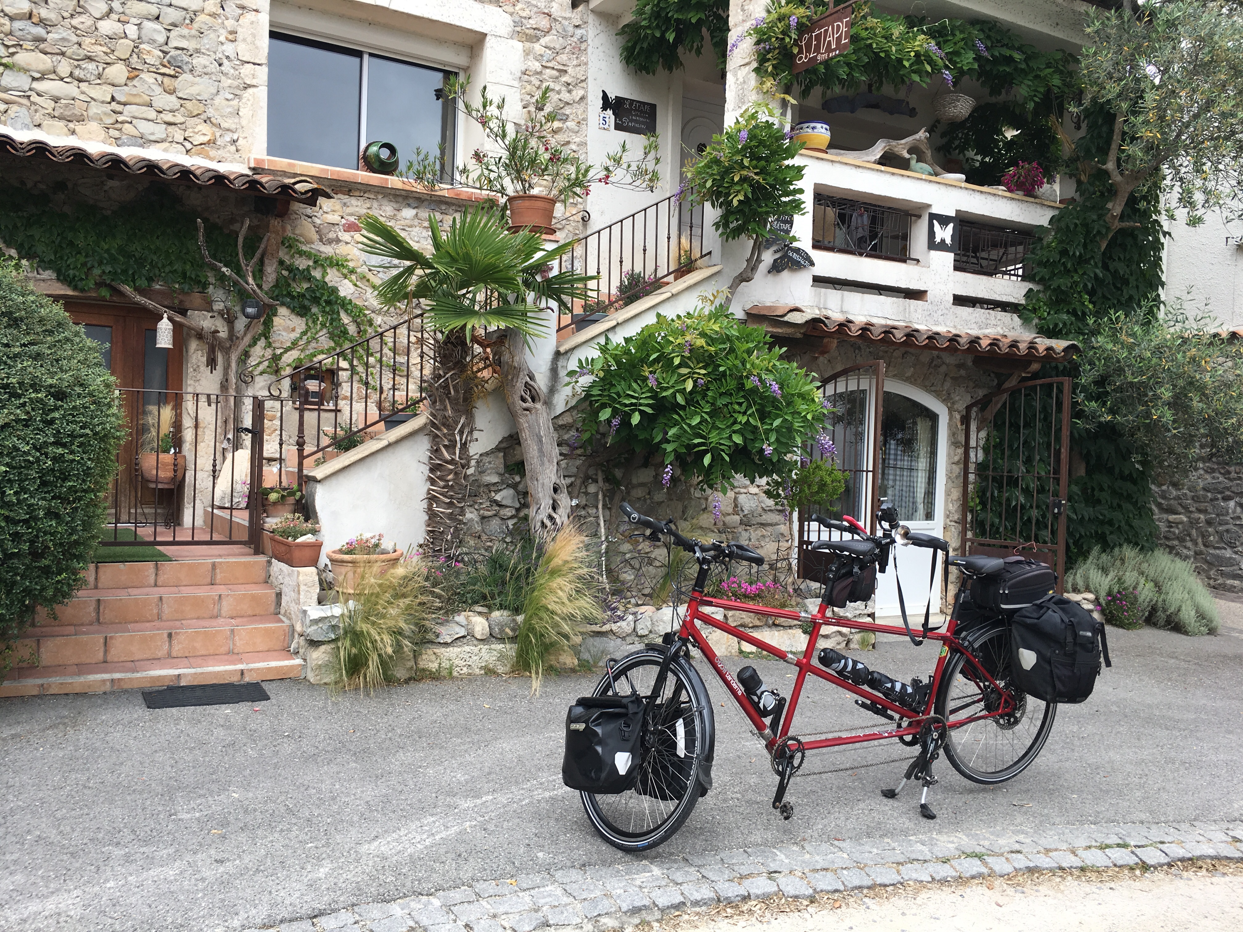 We were able to view it from both sides, firstly from the downhill approach and later (after lunch at a nearby Auberge) we got off the tandem and walked down to a beach on the river to see it from the west.