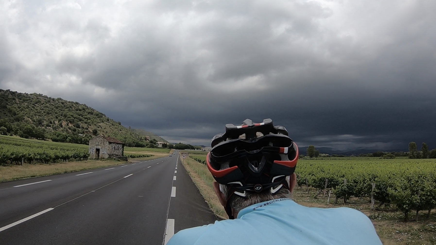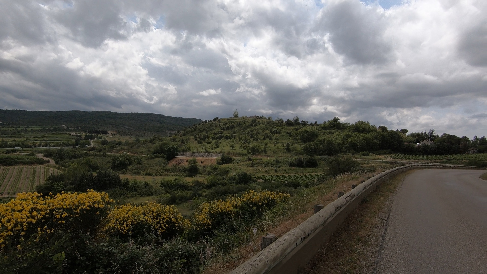 We took lunch in a little cafe, and watched the sky getting darker and then lighter again. The run back down to the main route took us past vineyards and more fragrant broom.
