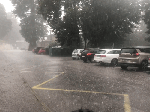We knew that at Vals-les-Bains we must keep the river to our left and not cross the bridge, in order to find tonight’s accommodation. Just before the bridge it did start to rain, so we stopped to put on our rain-jackets, cursing as we had so little distance still to cover, but wanting not to get wet whilst trying to work out exactly where we needed to go. Suddenly thunder was echoing around the hills and it was absolutely lashing down. On the right there was a bus-stop, so we pulled in to sit down under cover and work out the route. The rain became even harder, and then turned to the hail as predicted by our host. It was bouncing off the road and the roof of the bus shelter!