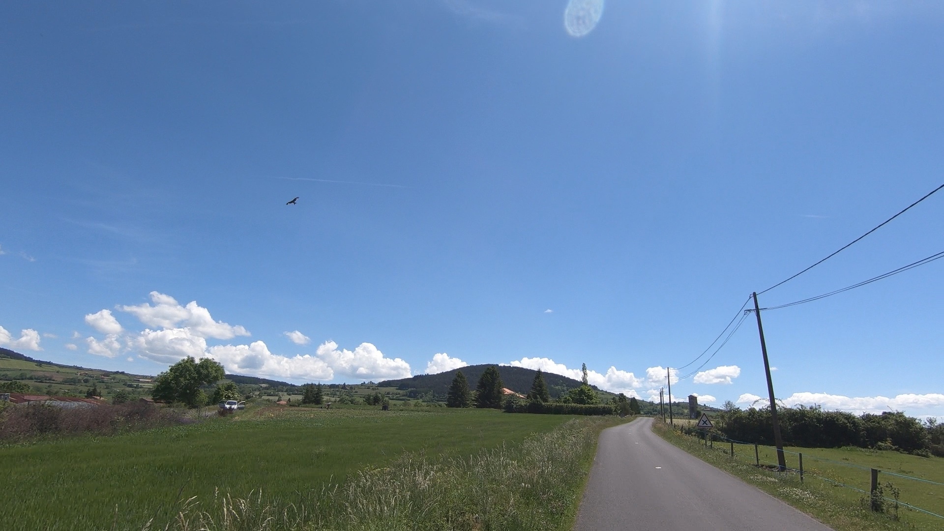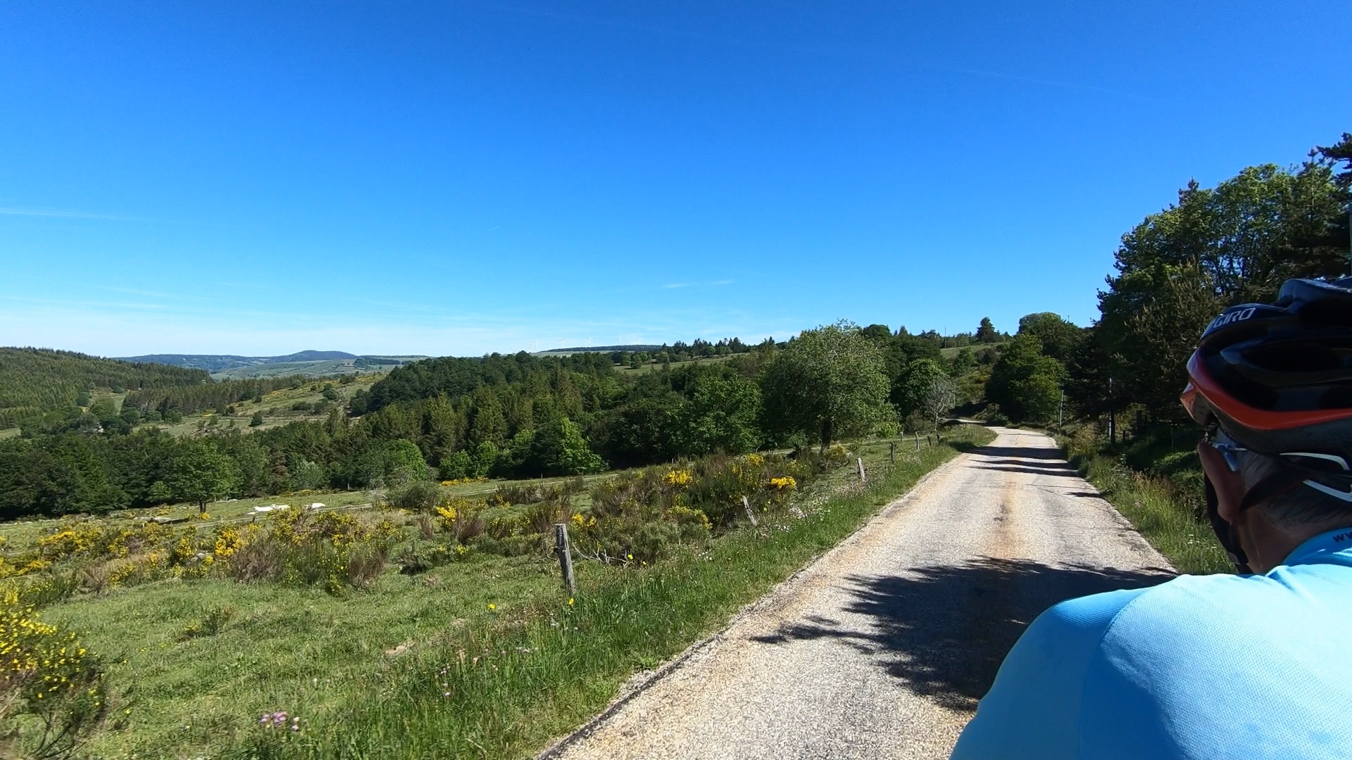 The first hill came up quite soon, but it was gentle, and we were both feeling quite surprisingly fine after yesterday’s exertions. We twiddled up in a pretty respectable gear, chatting about this and that, and enjoying the views of flowery meadows and the sound of birds and crickets. There was even the occasional ‘ding’ of a bell around the neck of a grazing cow – it felt almost like being in Alpine territory in the summer. Looking down at Jack the Garmin it was odd to see that we were still up at over 1200m.