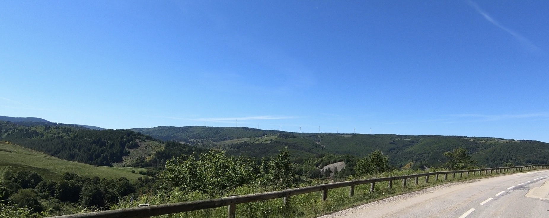As we descended below the dam we caught sight of the second big hill. It looked very steep! We started up it, noting the sign saying that it was a maximum of 10%, and although we were doing fine it was hard work. A chap on foot wished us ‘Bon courage’ as we ground past. We stopped half-way up for a snack bar and some water (yes, it was that bad!), but the refuelling helped and we managed the top section in good style.