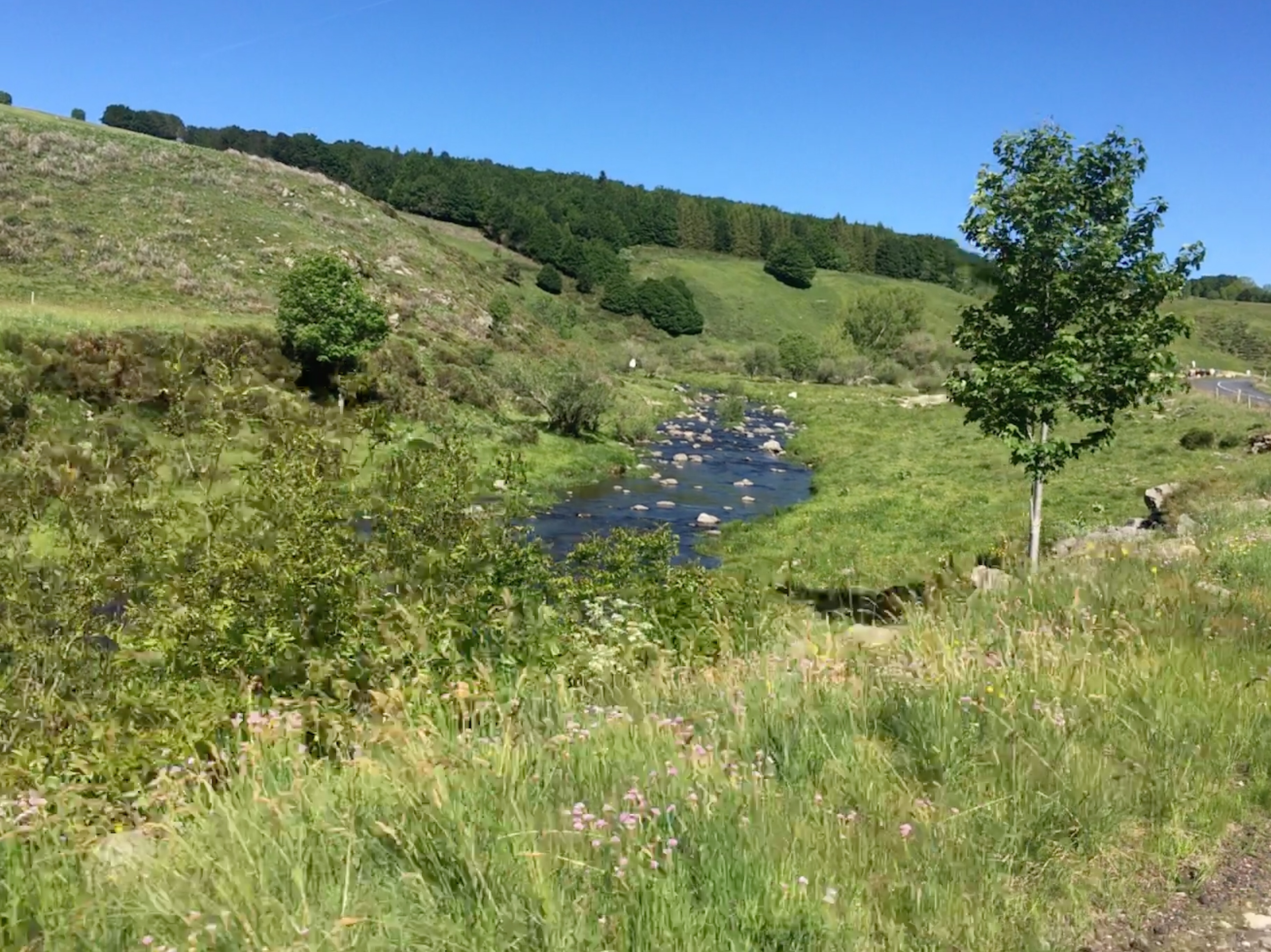 First, though, a lovely descent in the morning sunshine down to the valley where the river was trickling along, gathering pace but not much yet.