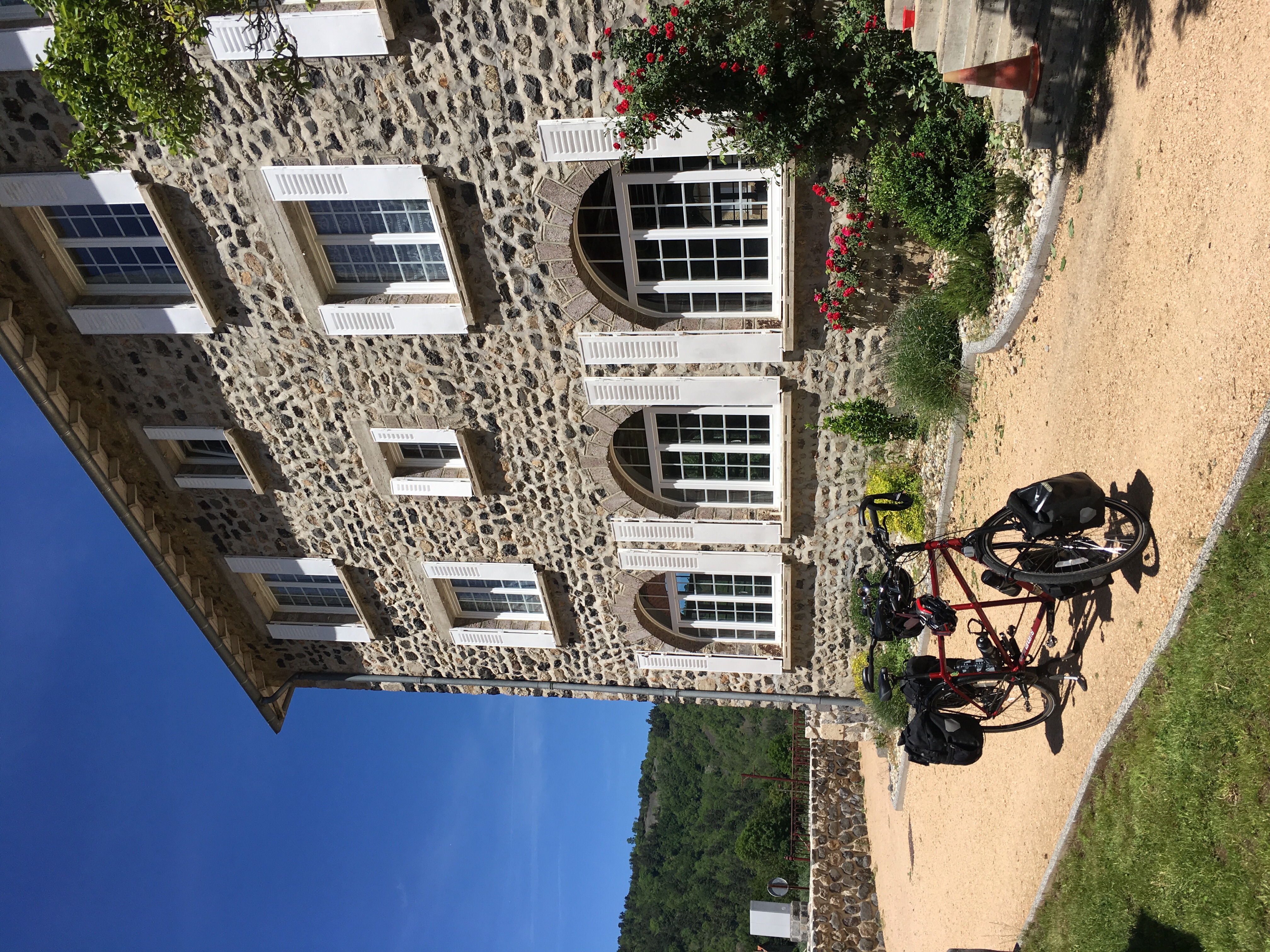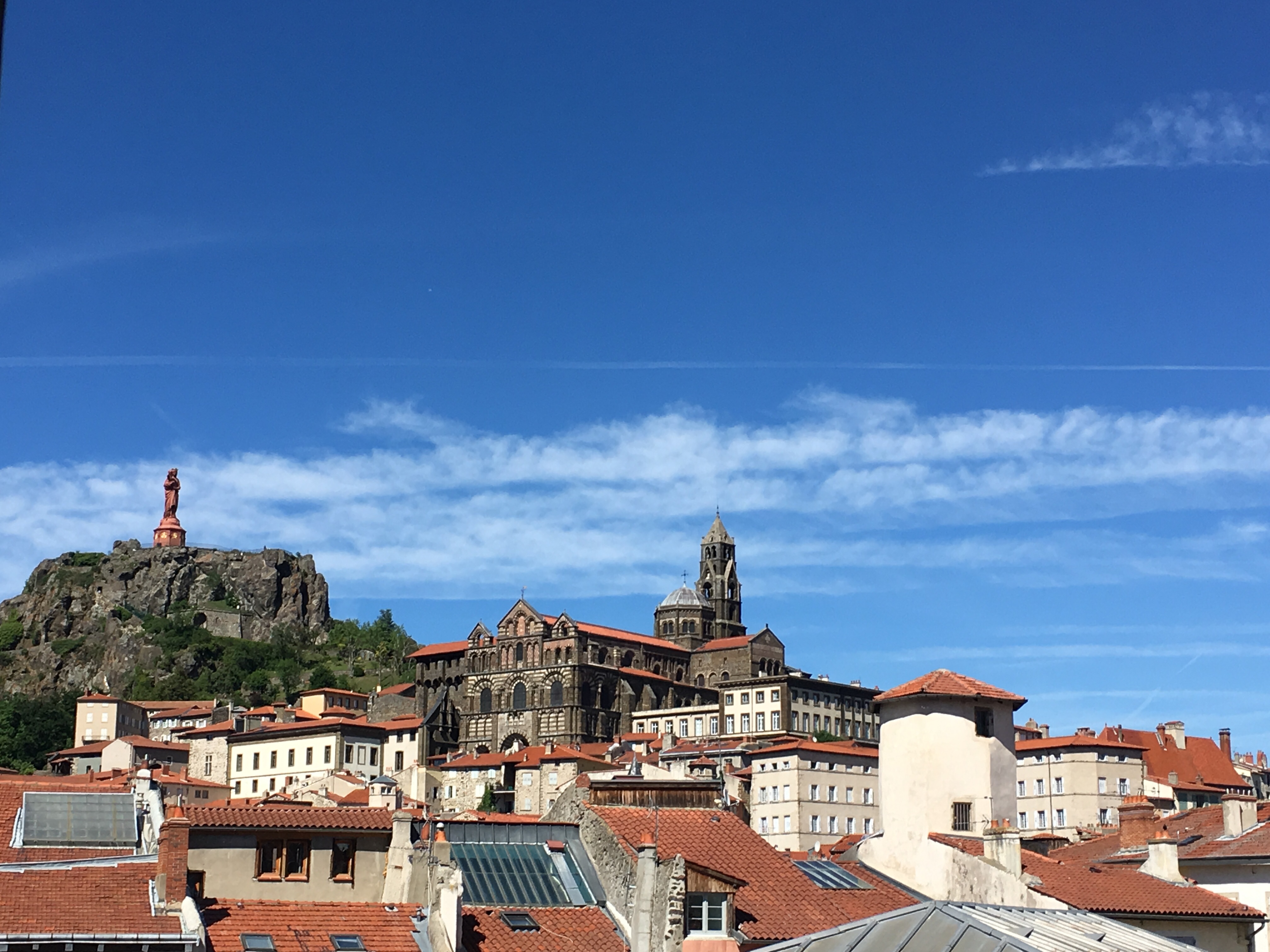 Two hills to go, then, and the first one, although not very steep,seemed to go on forever. We ground up past a horrible-smelling tarmac production facility, the legs really starting to feel the effects of two long days’ climbing now. A short descent and then the last hill arrived on the Garmin’s ‘pain’ profile. We both reckoned to have one last hill in us, and so it proved. We stopped at the top to text our AirBnB host that we were arriving imminently, and then flew down into Le Puy-en-Velay and wiggled round the one-way system to the apartment. It’s absolutely gorgeous, this is the view from the window: