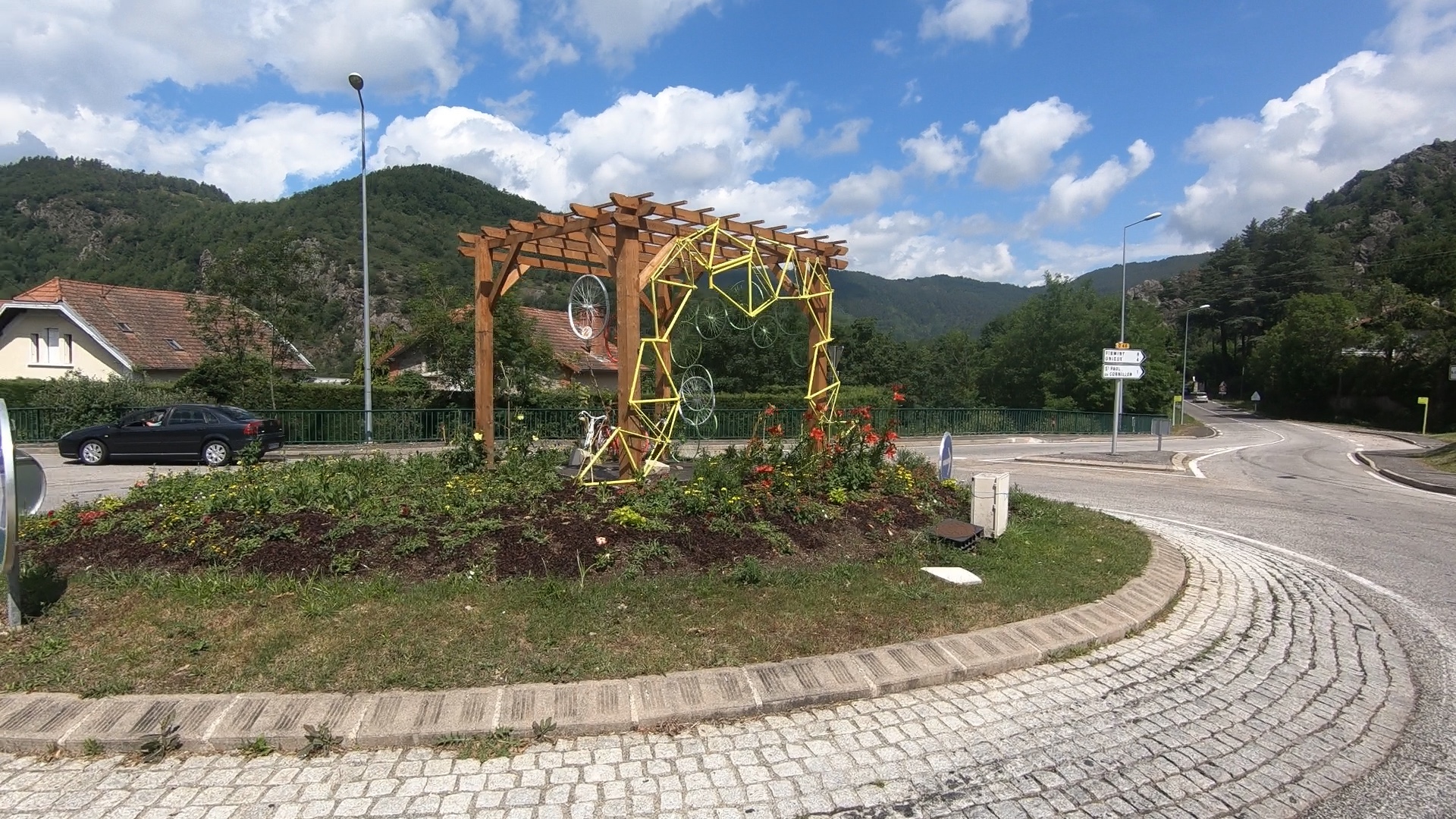 In truth it was over quite quickly, and we laughed rather nervously on the other side at what we’d just been through. On through Aurec, then, where the roundabouts were all decorated with spray-painted bicycles, huge flowers made of bicycle wheels and various other arty bicycle-related things.