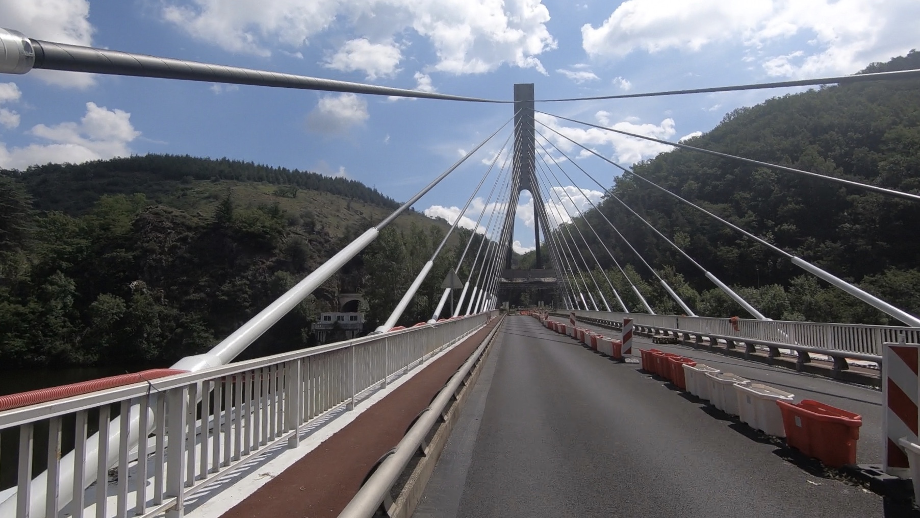 We could see another bridge, a huge metal construction, looming ahead, and knew we needed to cross it to start our climb to Chambles, but when we got to the turn it was all blocked off by construction traffic, with no apparent way across in the direction we wanted to go. This can be a serious problem on a long day’s cycling, especially when the river you want to cross is so wide that there are few bridges available.