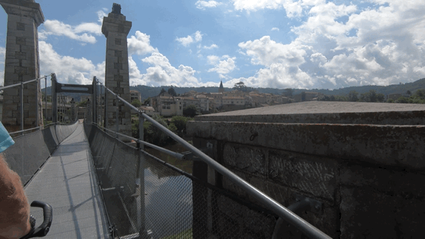 Just before Aurec we needed to cross the Loire, and we saw ahead that there were two bridges, one for cyclists and pedestrians, and the other for powered traffic. “Great!”, we said, “we won’t have to go over with the cars”.
