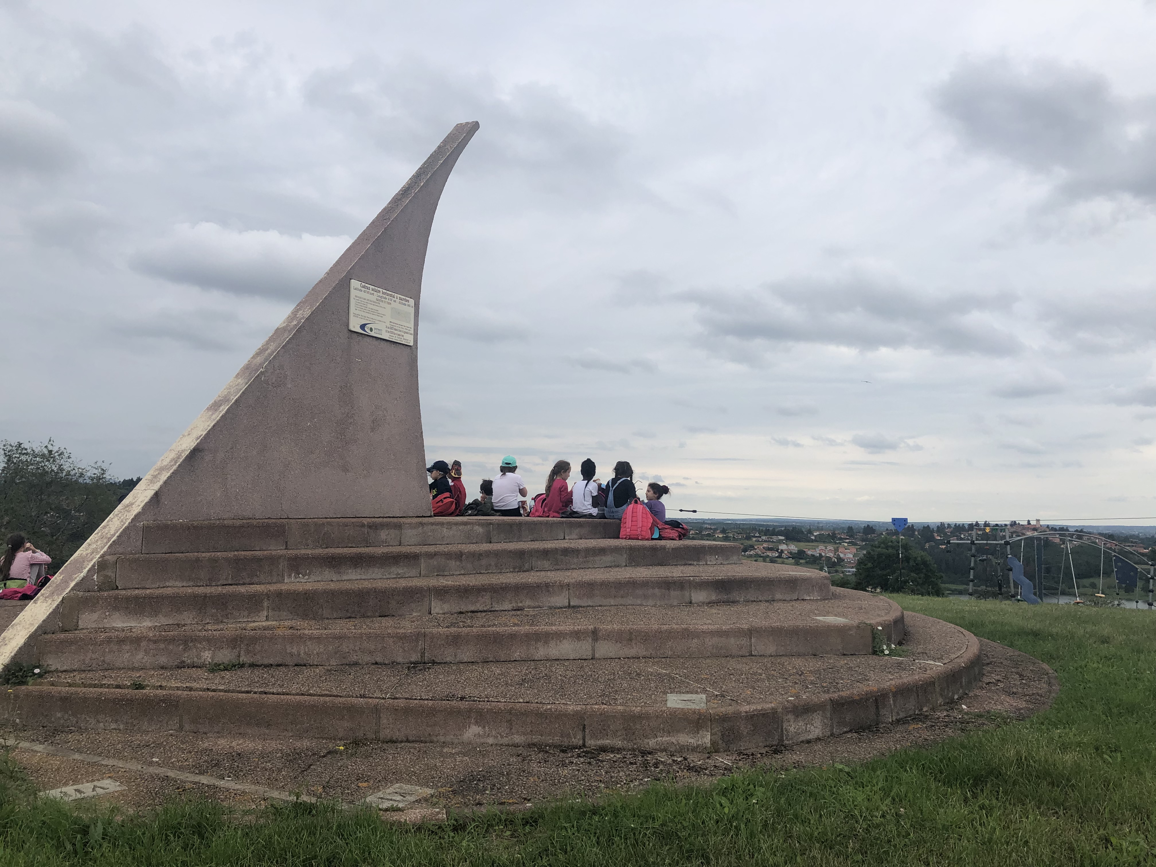 Shortly after the summit we diverted to a belvedere looking down over the river, having passed a sign advertising the biggest meander in the Loire. At the Belvedere, surrounded by a school party, was a massive sundial. No sun whatsoever, sadly, just the sundial. Still, the views were excellent, over the dammed river, in the final part of the gorge.