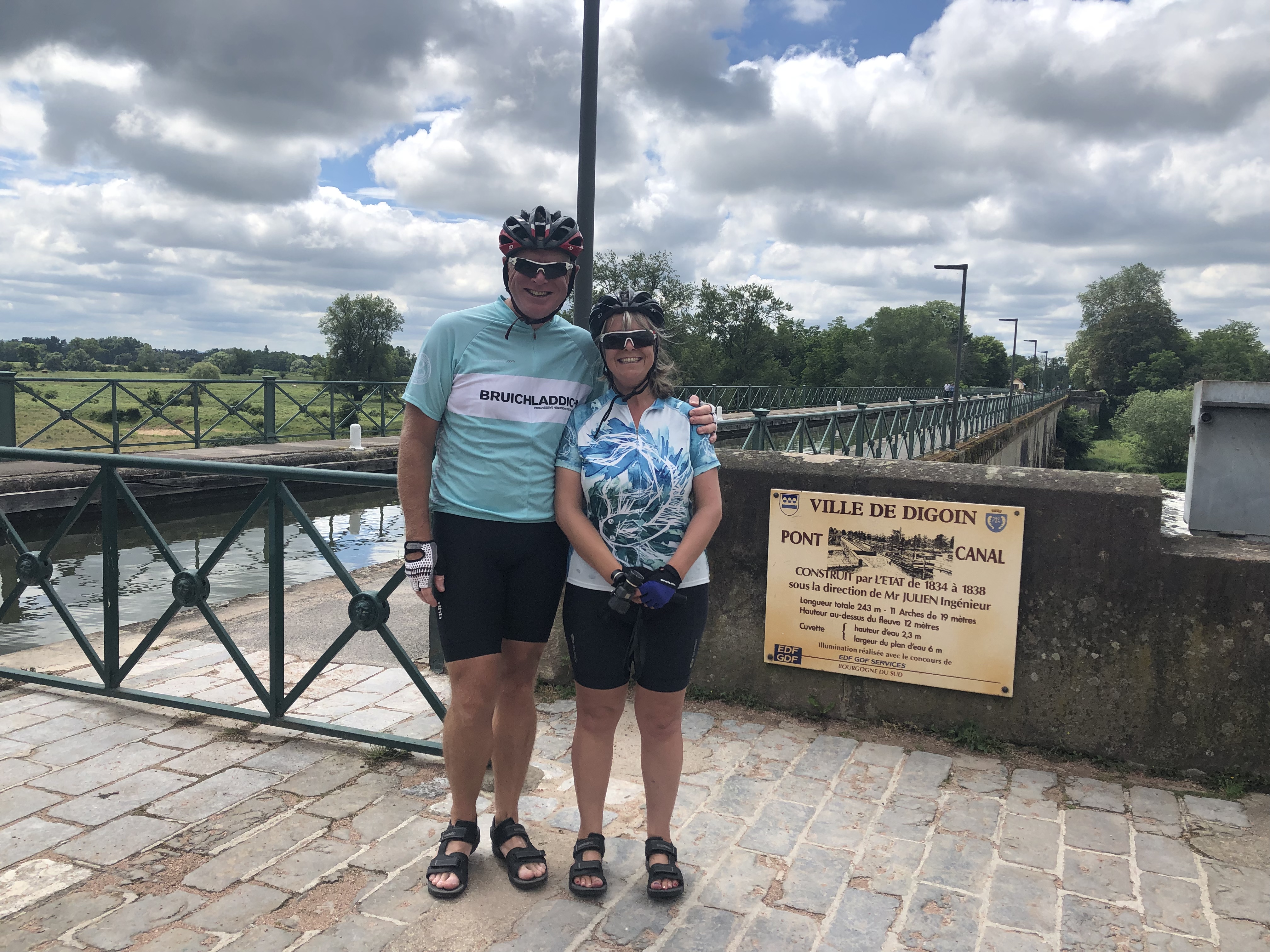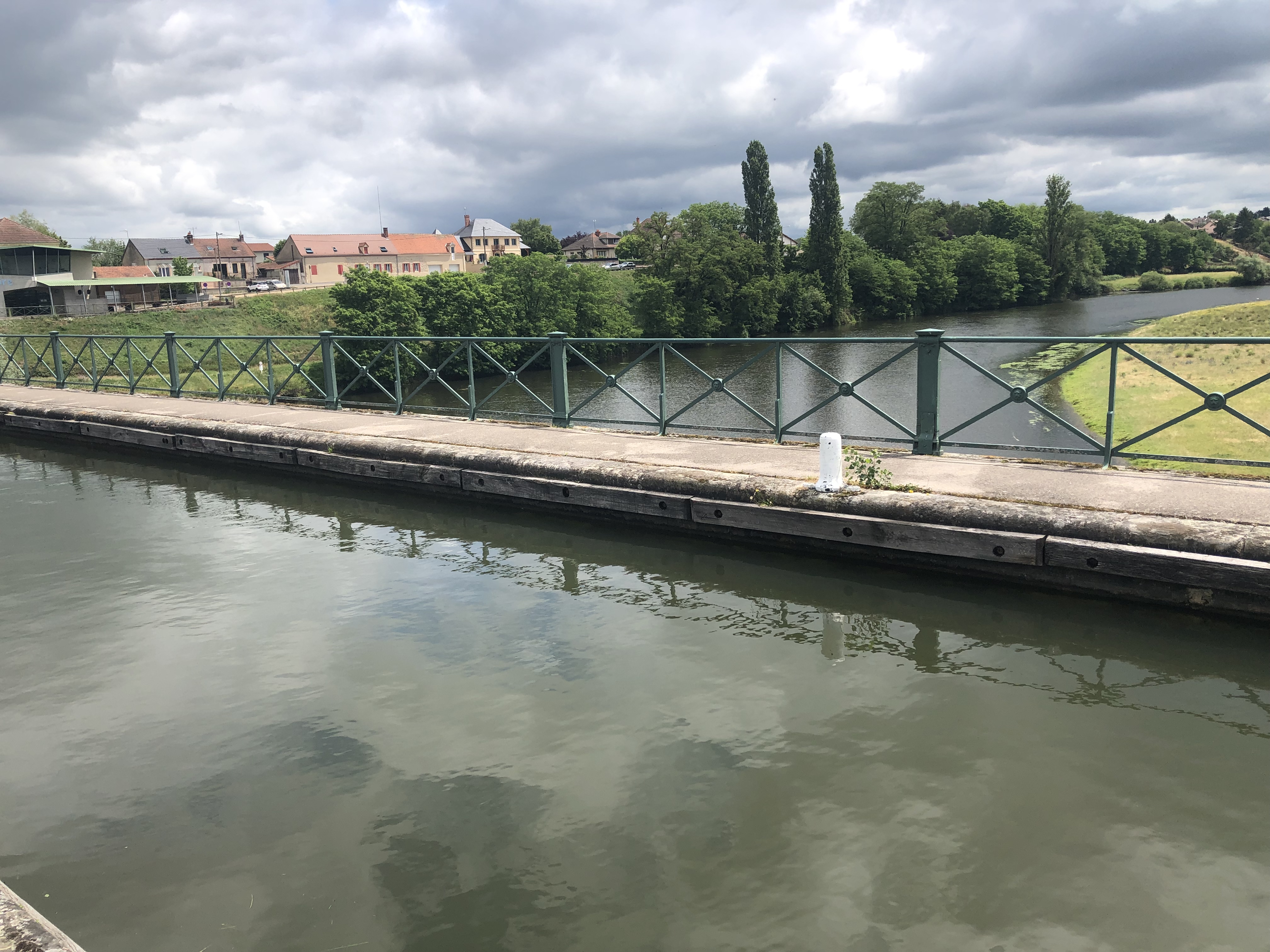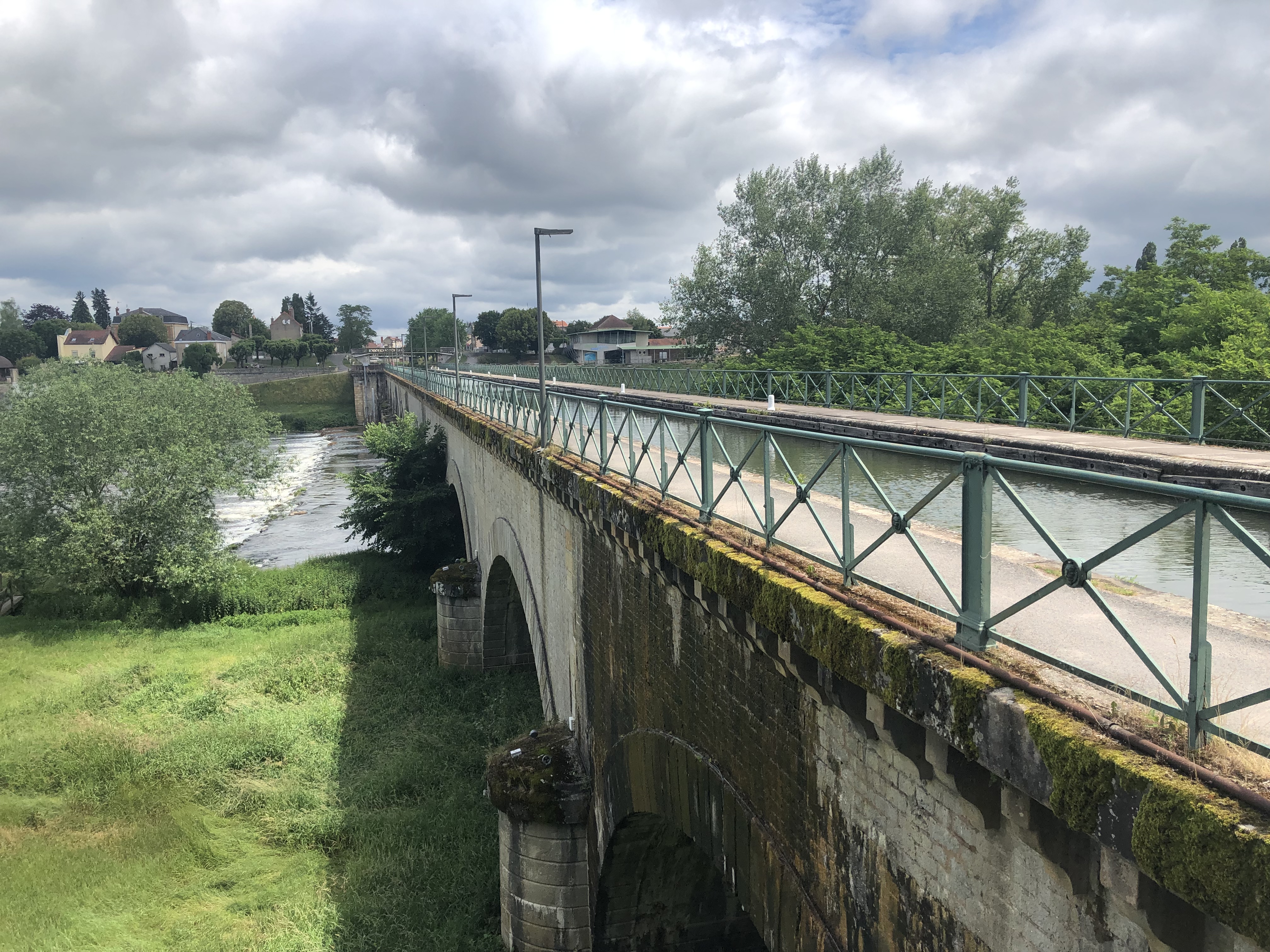 We arrived at the other side to find the touring cyclists had also stopped to take pictures, and we swapped notes about where we’d been and where we were going. They had started in Saint-Nazaire, our ultimate destination, and were following the Eurovelo 6 route all the way to Basel. They gave us some great information about Saint-Nazaire, where there’s a huge windy road bridge we really don’t want to have to cycle on, including some ideas for how to avoid doing so, which was fantastically useful.
