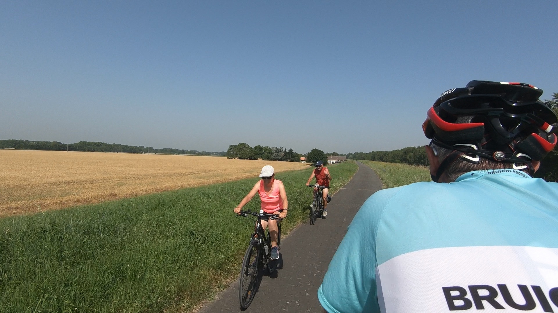Two French cyclists we’d passed earlier on the levée caught us up and we chatted for a while before taking the customary photos of each other.