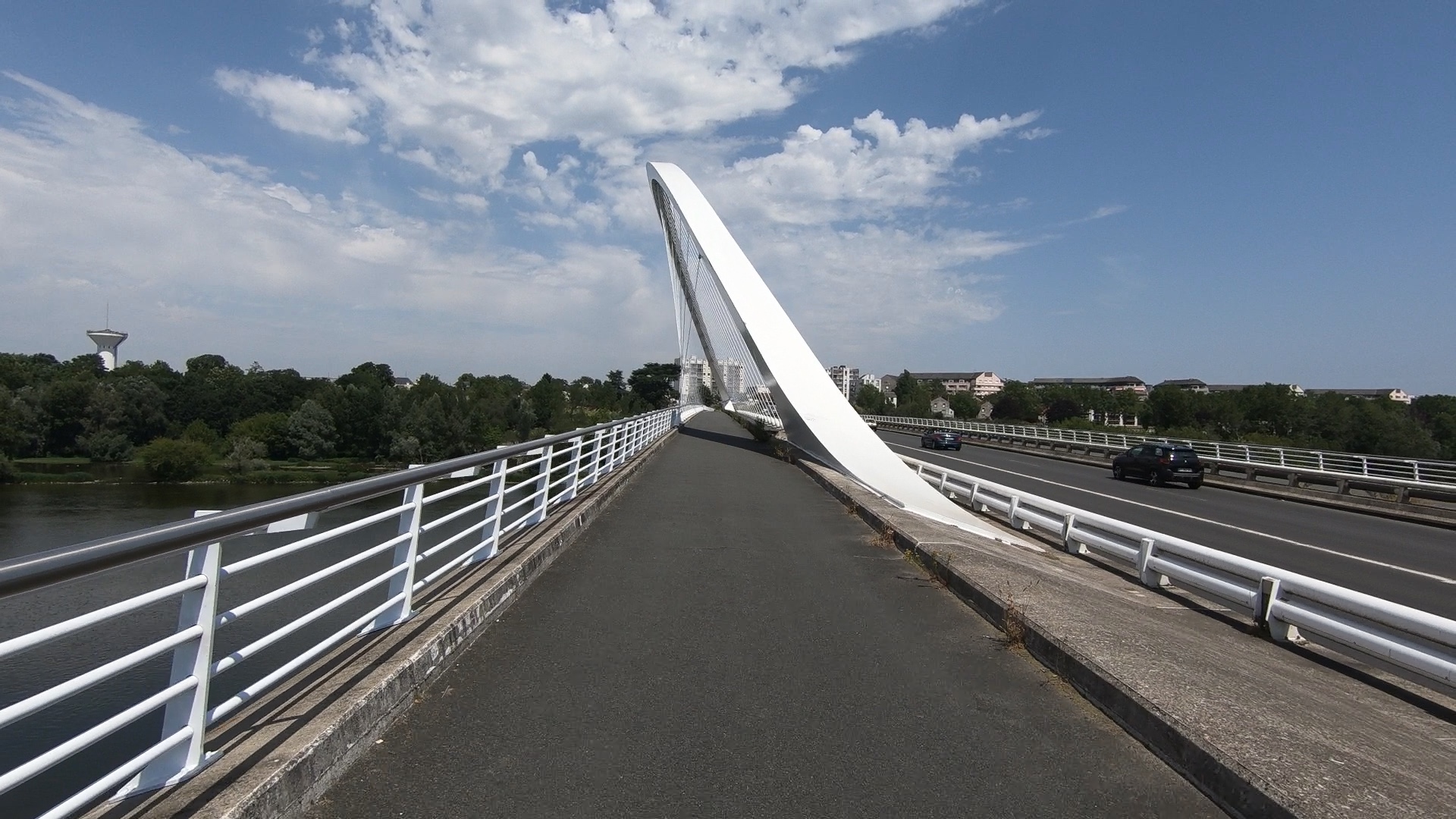 After lunch we cycled along the northern bank for a couple of miles, passing our hotel, before crossing the river once again, on a bridge which resembles the Gateshead Millenium Bridge.