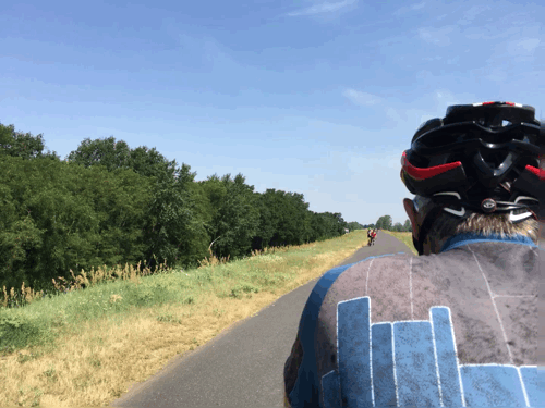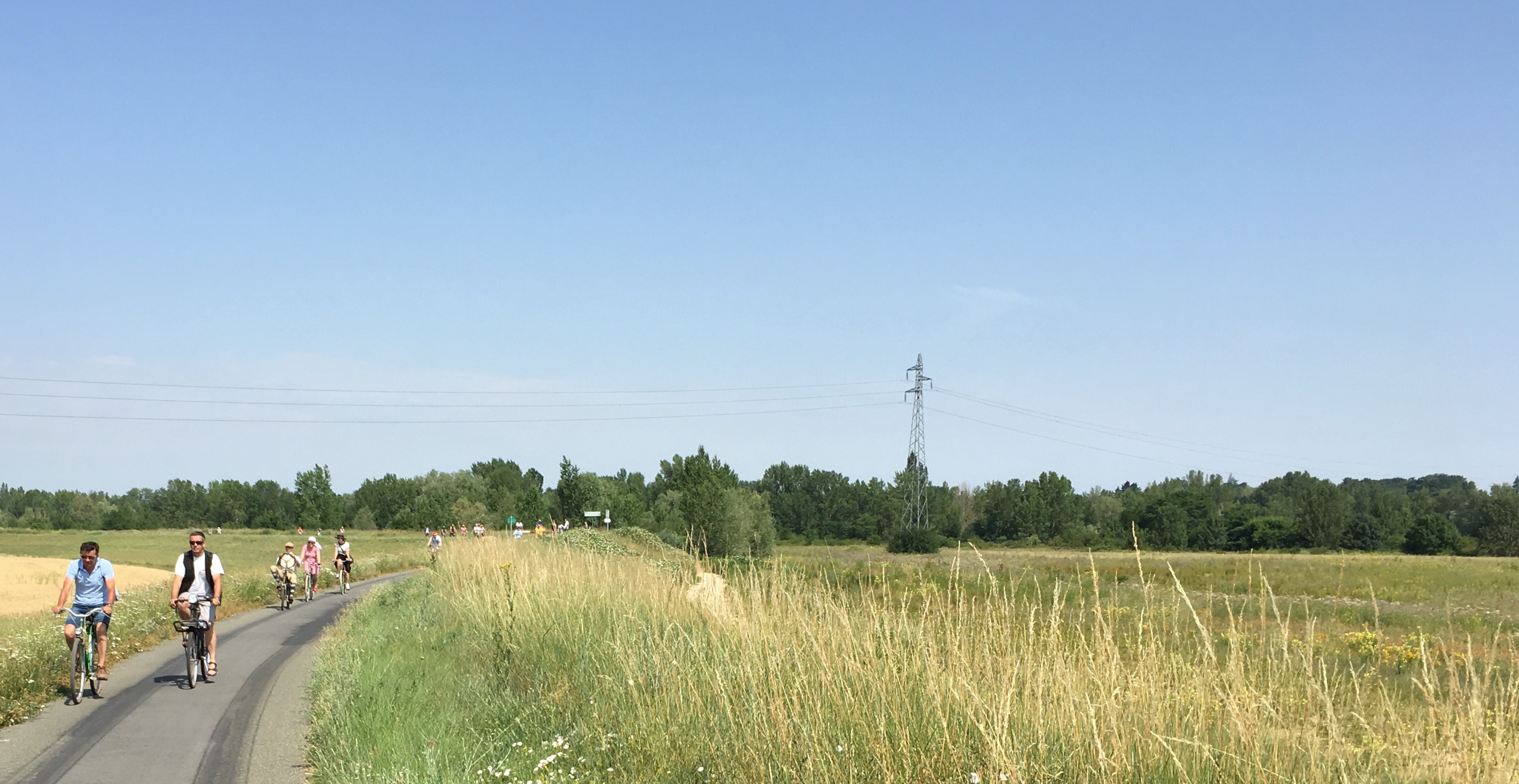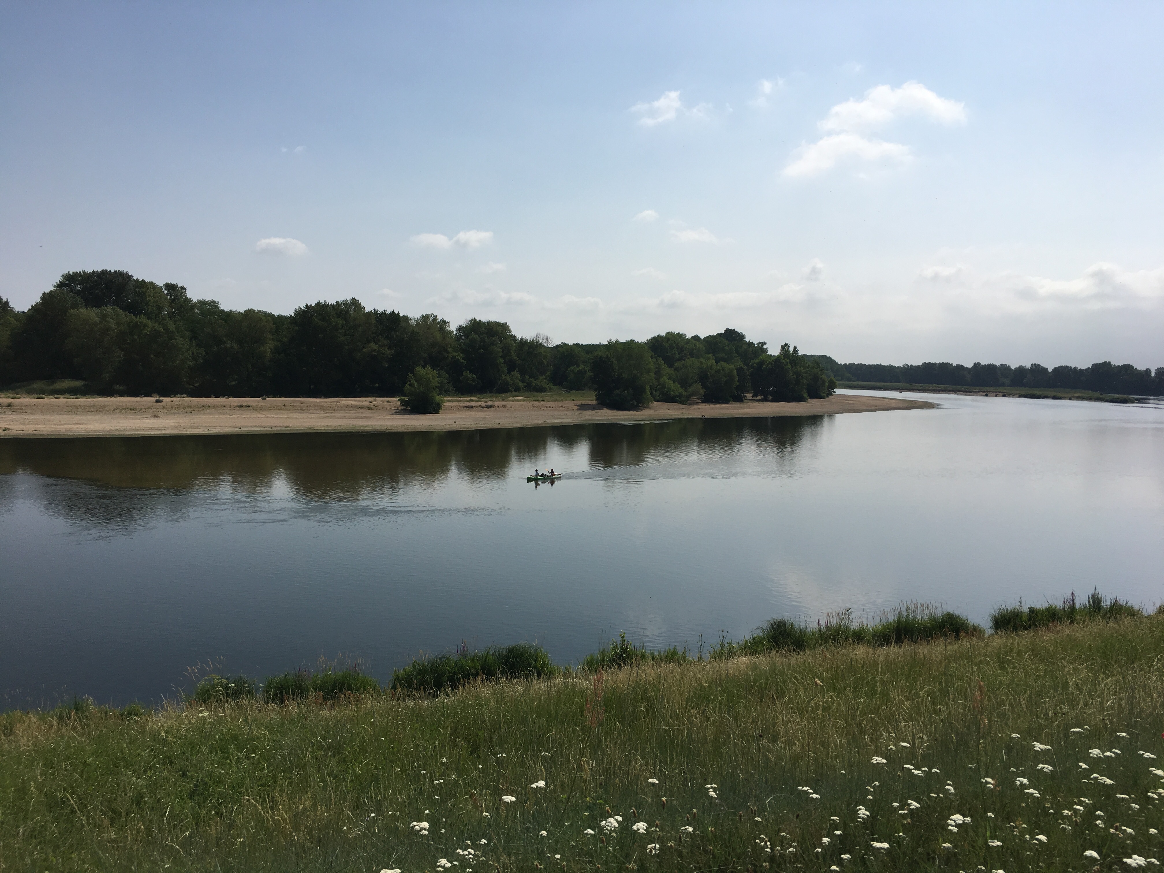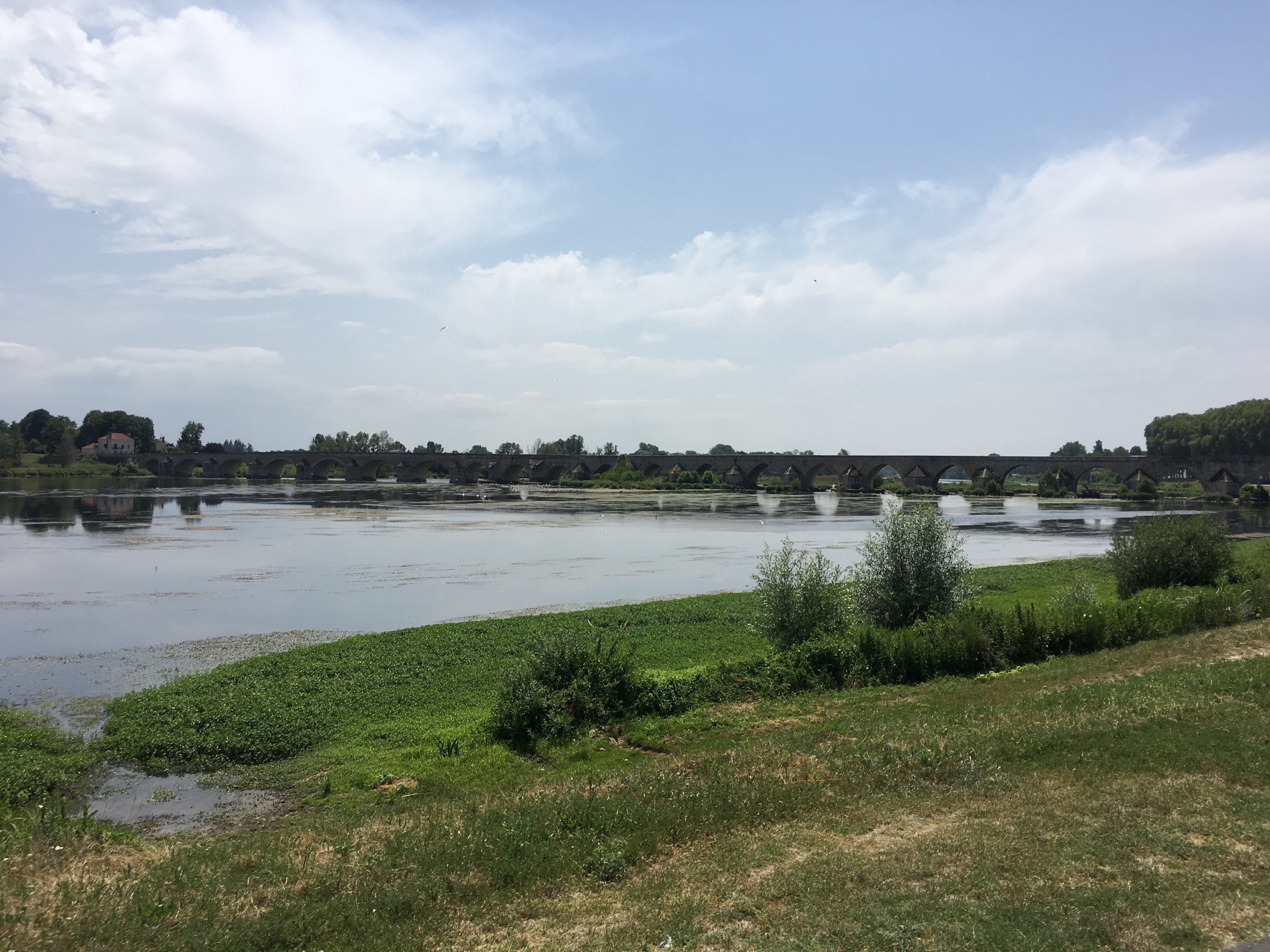 Conditions were much more benign, especially for the first hour, during which it remained cloudy. A brisk headwind helped too; cycling felt much more comfortable. We had crossed over to the southern side of the Loire – I wonder how many times we have crossed it up to now. If I get bored (unlikely, I know!) I might work it out. We were soon into a familiar routine of cycling on small dedicated cycle paths and sometimes on the levée, with the ever-widening river off to our right.