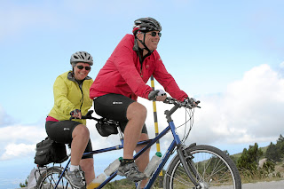 We decided to skip the brandy and amphetamines. The road from Bédoin rose gently at first, at a gradient of about three percent, providing a welcome warm-up for the muscles. The day was growing warmer, but we could see signs of the Mistral above, as the clouds were scudding quickly across the sky. After about three miles the climb kicked up in gradient to seven, then nine or ten percent. We have tackled much steeper climbs at home, but they were much shorter and usually shelved. This climb though was relentless, twisting through the forest. Frequently we were overtaken by riders on solo bikes (one cannot climb as quickly on a tandem). Some offered encouragement, some expressed doubt as to our sanity, some engaged us in conversation. A few passed without a word, listening to their iPods or perhaps preferring to concentrate on their objective. One or two dismounted from time to time and walked, but we stayed in our saddles and climbed steadily on, stopping occasionally to have a drink or eat an oat bar.