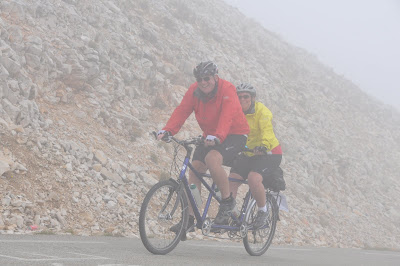 After our short break we remounted and set off into the shattered landscape. Only six further kilometres to go! The gradient had eased somewhat, and the first two kilometres passed really quickly. As we climbed ramp after ramp though, the wind grew dramatically in strength, and it was difficult keeping the tandem going in a straight line. We had donned arm-warmers and rain jackets when we stopped, and it had proved to be a good move – the wind was bitterly cold, and gusting at fifty-five kilometres per hour. So our main struggle now was not the gradient, but the wind. Again, we saw several riders choose to push their bikes through the windier sections. At the Col des Tempêtes a particularly violent cross-wind blew us halfway across the road. The visibility was poor now too, we had lost the spectacular view across Provence.