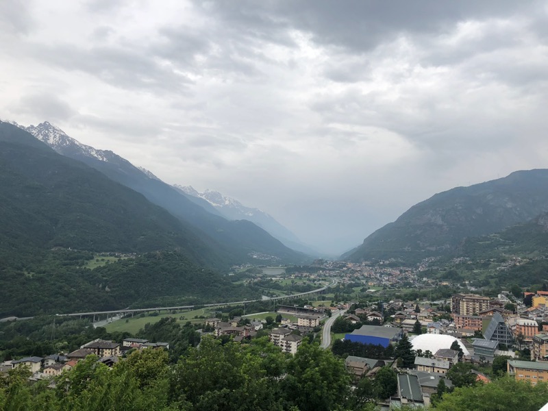 There are several tunnels – wow, they were cold. Mostly, we felt the air thickening (Cervinia is at over 2000m in altitude) and the temperature rising, the tandem felt good and it was wonderful to be on our way at last after all the build-up. As we reached lower altitudes the valley became greener, meadows on either side and the trees in full leaf.