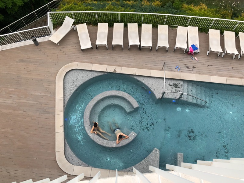 After lunch it was back to the Matterhorn roundabout, past several noisy, rushing waterways taking the winter meltwater down to the valley flow. The colour is amazing – opaquely green with all the minerals it carries. Through Chatillon, past the entrance to the autoroute and onto the Saint Vincent road. We found the hotel, parked the tandem, checked in and, after a quick shower, headed straight up the funicular to the Terme, a lovely spa complex with thermal pools. It was fabulous, especially the outside pool, in the fresh air, wildly forested slopes on either side and a view right down the valley.