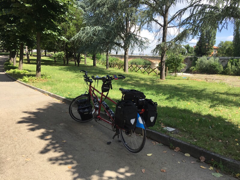 Our lodging tonight is very close to the duomo, so we headed there and had some delicious lunch under the arches in the shade of the duomo. After a rather chaotic check in to our Airbnb apartment, we hit the bike shops of Pavia, coming back with a successfully re-shod back wheel, albeit with a slightly wider tyre.