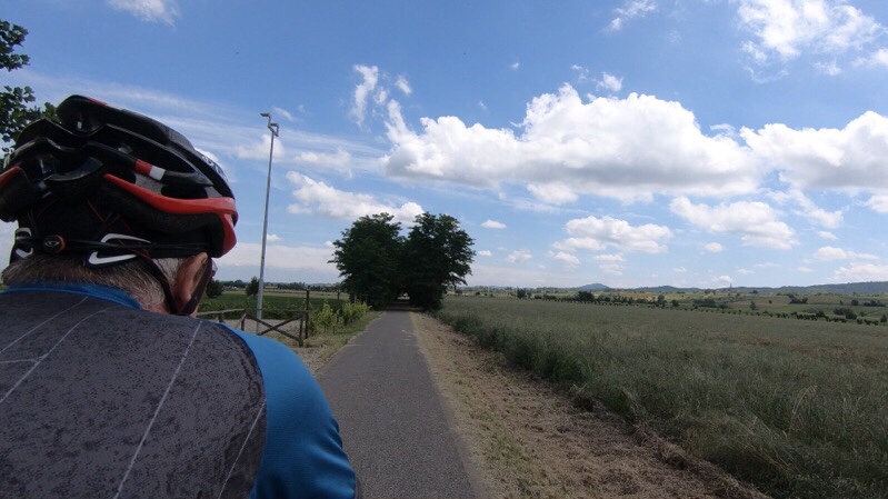 Once we were off and running properly, we hit cruising speed quickly on the cycle path out of Salice Terme, towards Pavia, which we know now from yesterday’s cyclists is pronounced Pah-vee-ah. The path was quiet, smooth, it was great to cycle with no traffic and just the occasional pedestrian to ‘ciao’ with as we whizzed past.