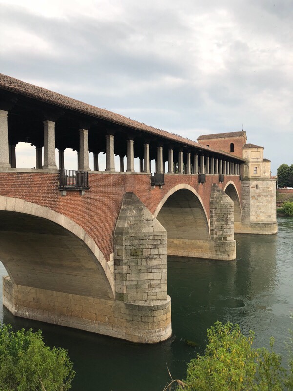 After the crossing, we left the busy road for a smaller one for a while, which was a relief. Pavia seemed to come up really fast, in no time we were crossing the Ticino, parallel to Pavia’s famous covered bridge.