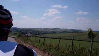 We were greeted with cloudy skies at breakfast-time as we cycled south toward Lumbres, but the clouds rapidly cleared and we continued under blue skies. The roads became progressively more quiet – much more so than equivalent ones in Britain. As our legs warmed up we started to ascend onto a plateau, crossed on occasion by small valleys running east to west. It felt good to be exposed to some early climbs – any “start-of-ride” cobwebs were soon blown away, as we passed fields of wheat, barley, maize, beetroot and peas. Frequently we encountered poppies at the side of the road, in vivid red patches. We were surrounded throughout the day by stunning vistas – we normally pass through the Pas de Calais at high speed on the autoroute, what delights we miss.