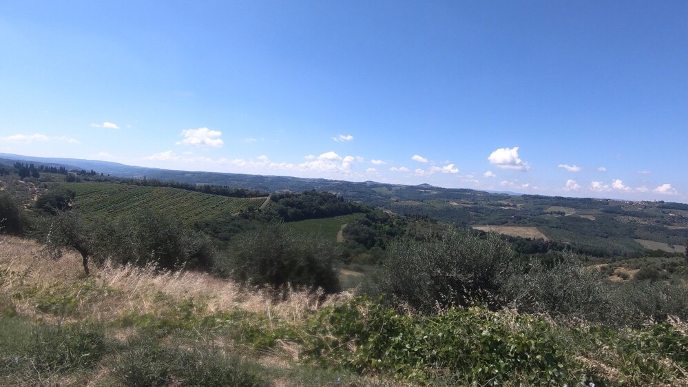 A short day today, but we knew there was a stiff climb to get up to reach San Casciano in Val di Pesa. We pedalled out of Villanuova and turned down into the Val di Pesa. The ‘Fi-Pi-Li’ road runs through it, a huge highway running from Florence (Fi) via Pisa (Pi) to Livorno (Li), and there was a big queue of traffic waiting to get onto it. We managed to bypass most of the queue, and avoid accidentally getting on to the Fi-Pi-Li (bicycles very much not allowed!), and then carried along the valley floor to Cerbaia, where the road started to kick up.