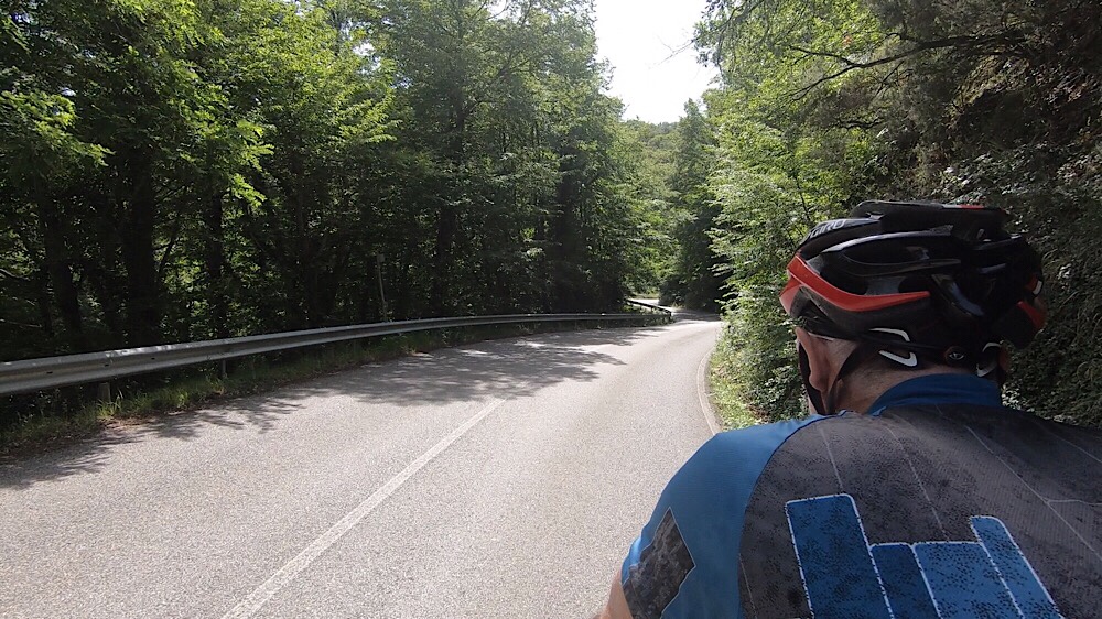 The rest of the day was on a Strada Regionale, busier but fine, some climbing and descending, somehow more taxing than the woodland climb, but we were still well within ourselves. We had a quick lunch in a cafe at Pontecino, where bizarrely Wimbledon was requested on the TV by one of the locals.