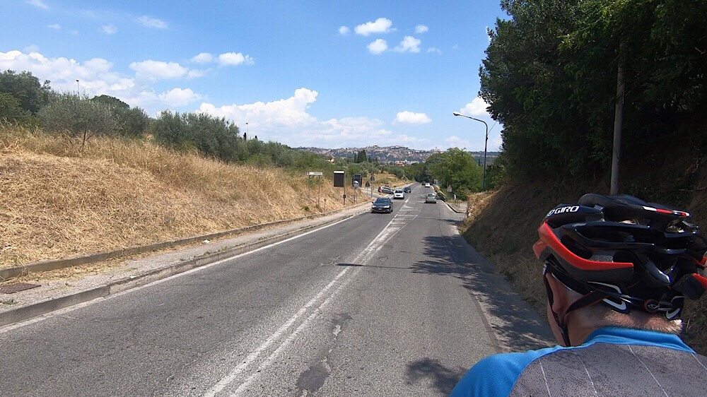And so to today. Our target was Perugia, a hilltop town, and we knew the last part would be challenging. We raced through the early kilometres just fine, including a section on an excellent cycle path. We caught up and passed an elderly gentleman on the path, he tucked in behind and announced that he was seventy seven. He clearly decided that we weren’t going fast enough for him, and passed us, reiterating to the Captain that he was seventy seven. He looked very good! When he continued on the cycleway as it became more gravelly we decided to follow him – it saved us a little climb, perhaps. We had a good view back to Castiglione.