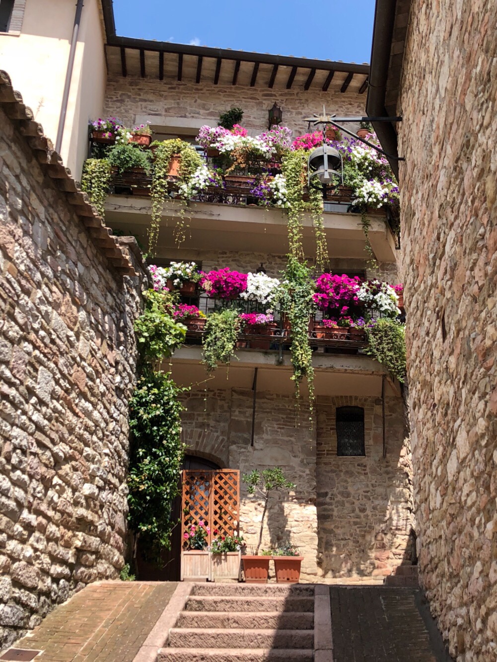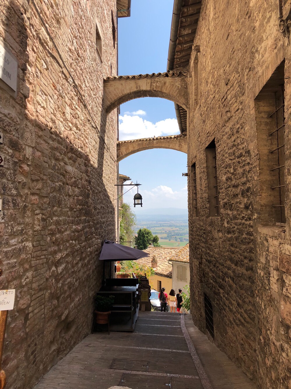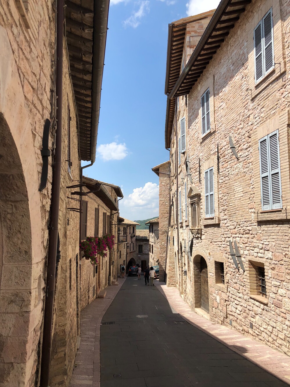 It was a slightly surreal experience, to be honest. The streets were full of nuns and friars, most of the shops sold religious ‘tat’, giving the whole place something of an air of unreality. Set against this the sheer beauty of the place, the architecture, the views down to the valley and across to Perugia, and the ever-present white and pink stone buildings.
