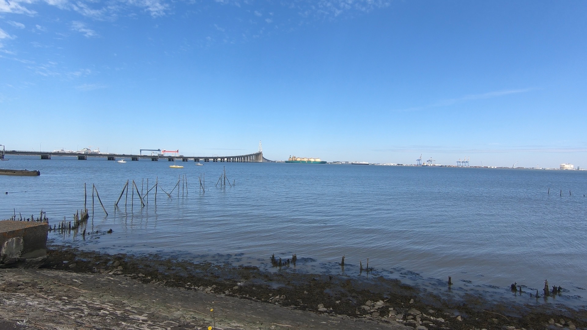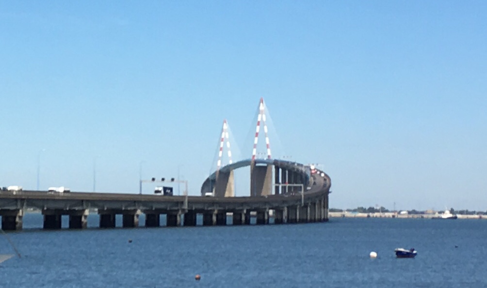 Just ten kilometres to the sea for us too now, and we came round a corner to see the enormous Saint-Nazaire bridge, much feared by cyclists. It’s more than three kilometres long, connecting Saint-Nazaire to Saint-Brevin-les-Pins, and the centre span is extremely high, meaning that wind conditions can cause closures and traffic restrictions.
