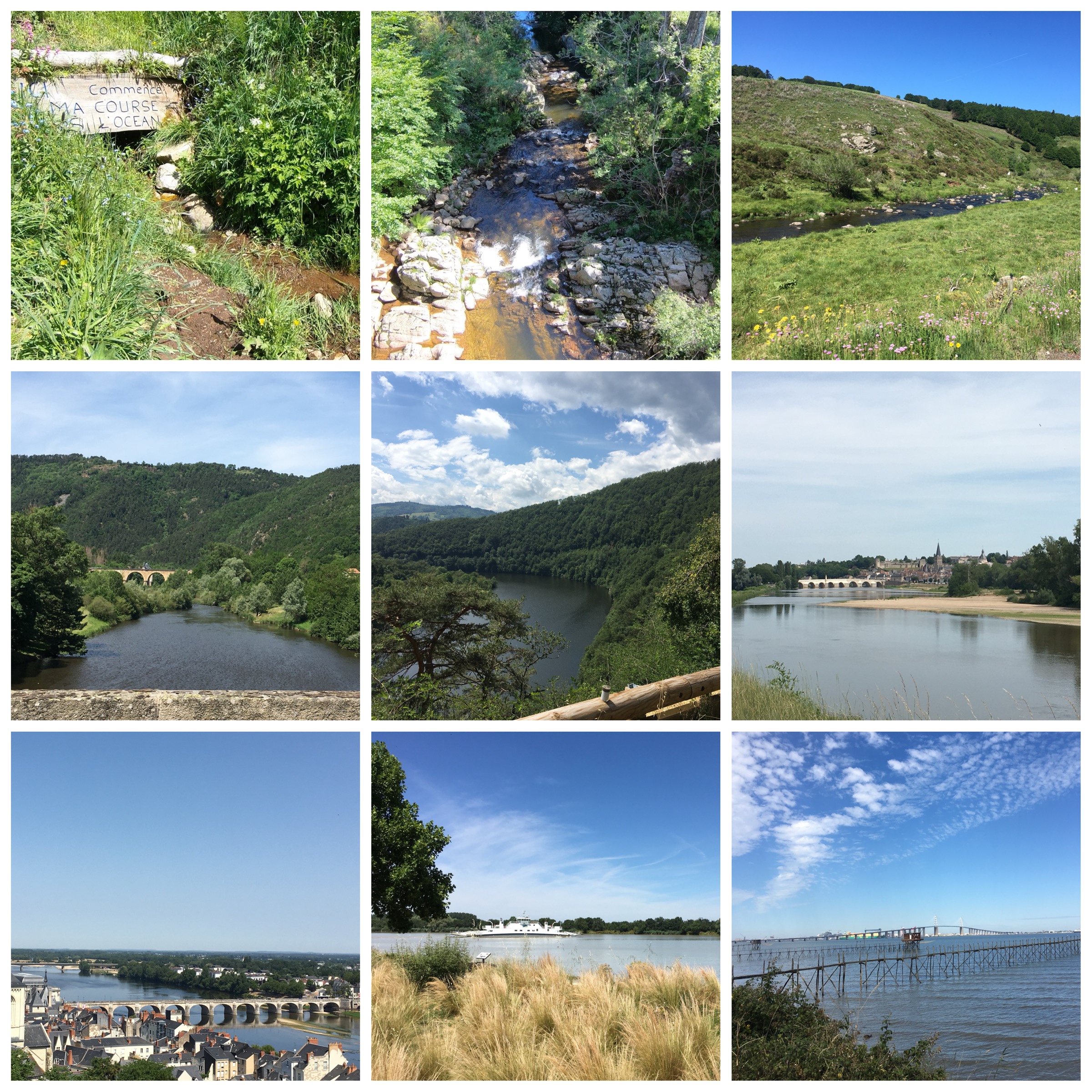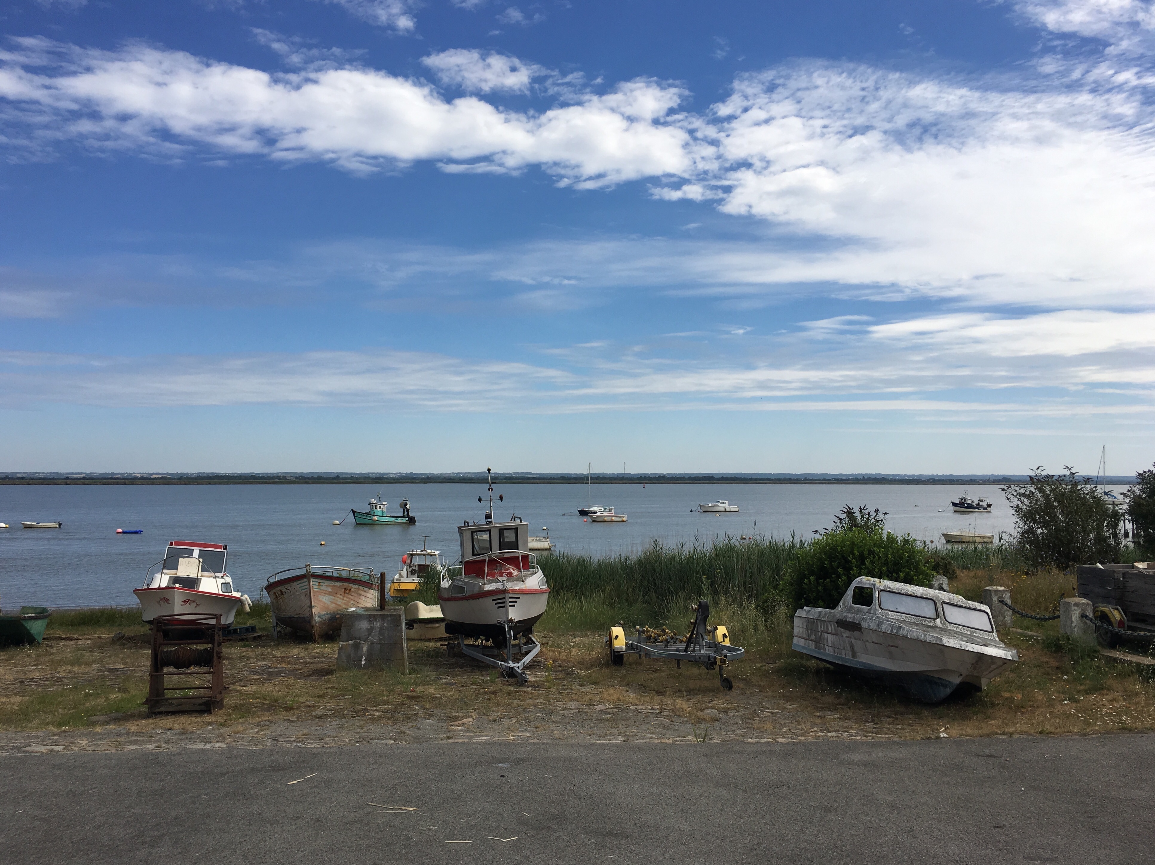 So there it was at last, the Atlantic Ocean, the ultimate destination of that little trickle of water we’d seen rising at Le Gerbier de Jonc, and which we’d followed reasonably faithfully as it grew and wended its way north and then west. Saint Nazaire looked immensely far away, and it was difficult to pinpoint the spot where river became sea, but this view just about captures both (and a car park…!)