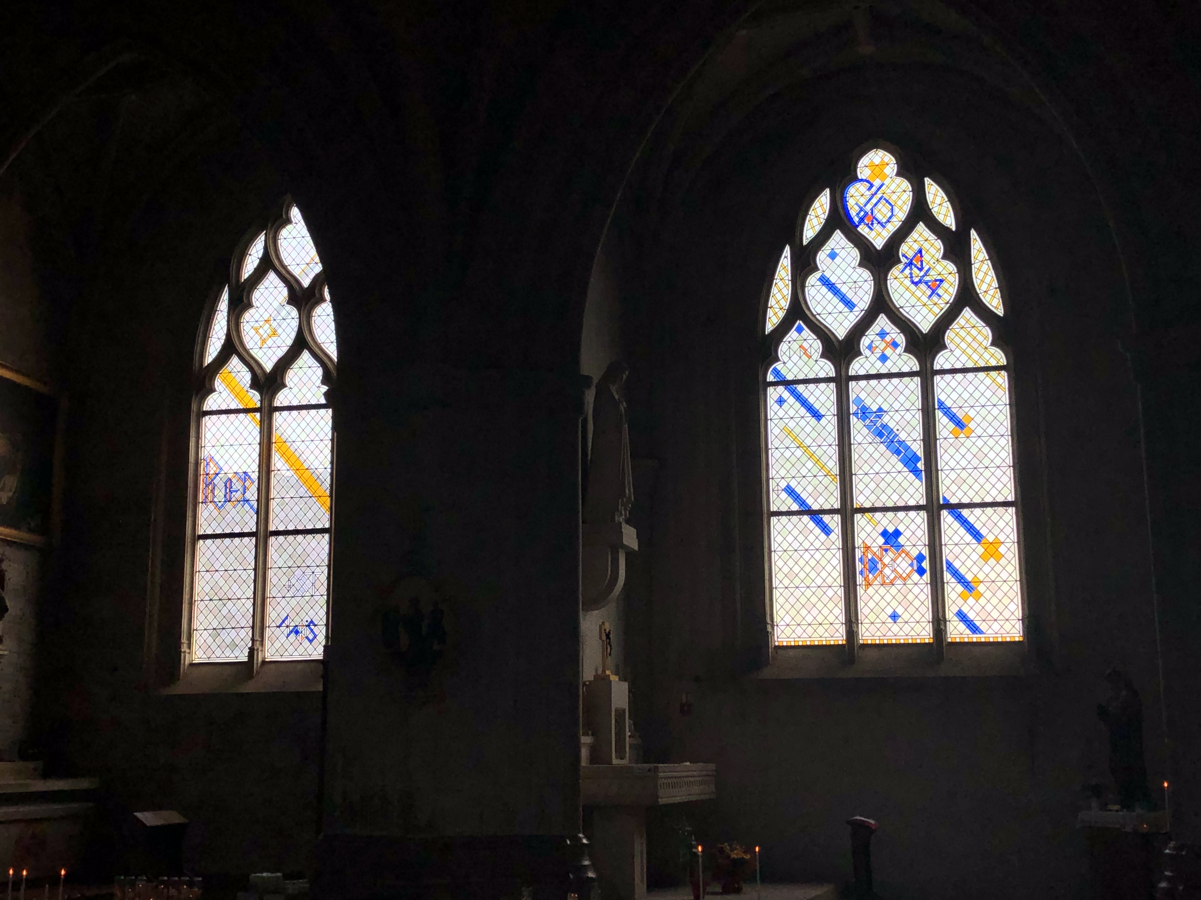 Turning right at the top of the steps we discovered the town’s unusual cathedral, set high on the hillside. Inside it had modern stained glass based on the theme of calligraphy.
