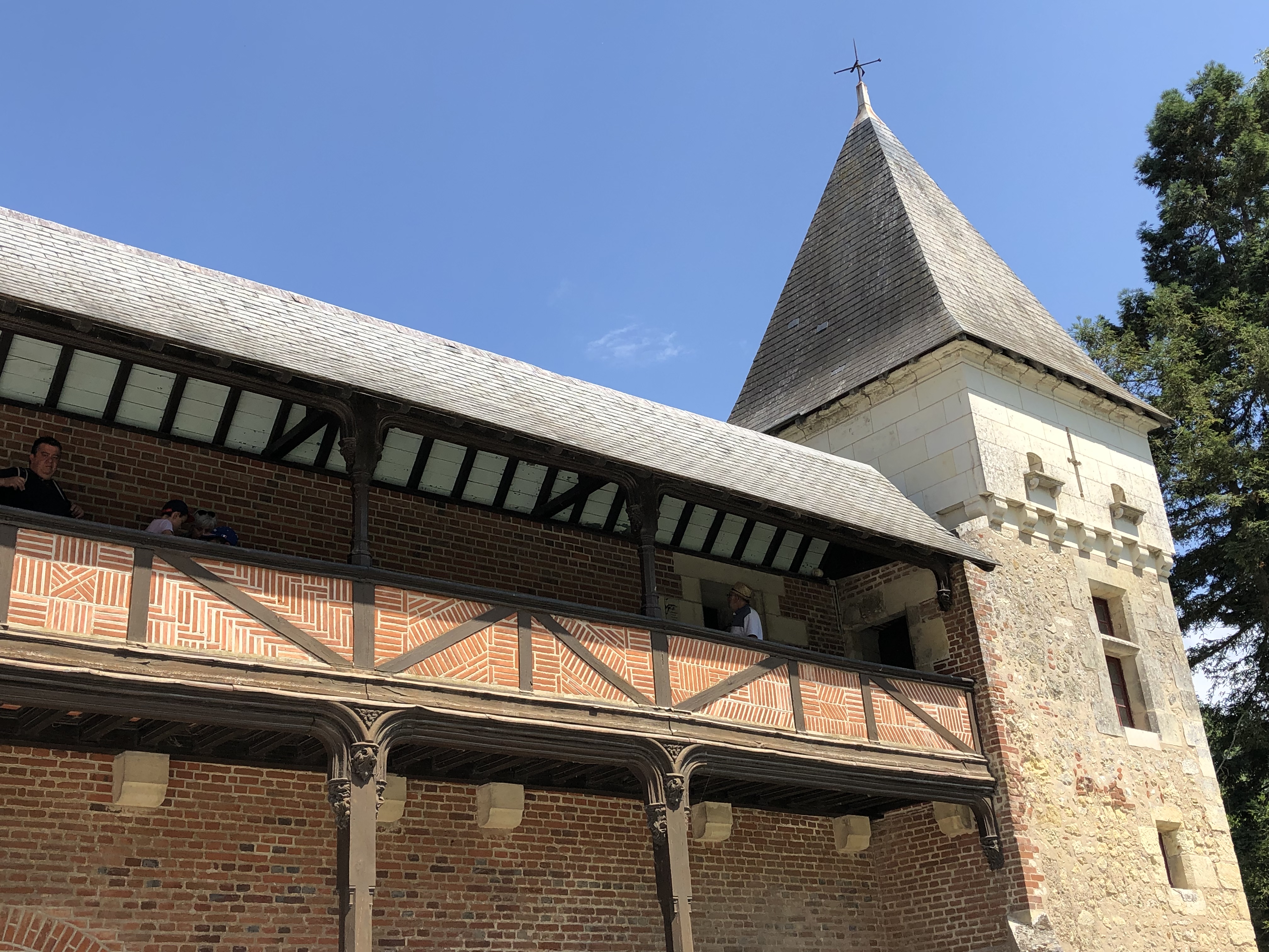 Returning to the tandem we cycled uphill to take a look at Clos Lucé, a delightful brick building with a Tuscan-style elevated loggia.