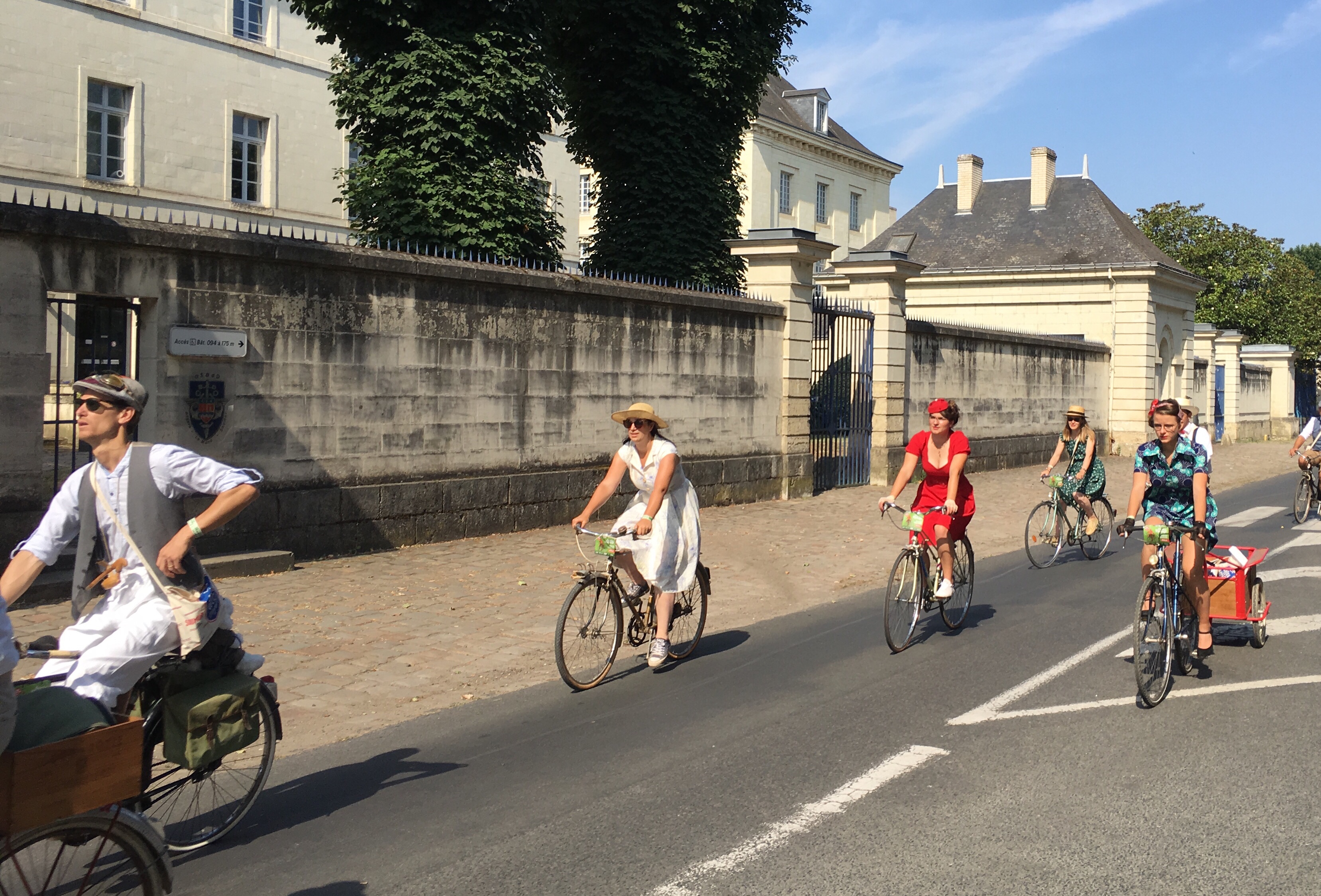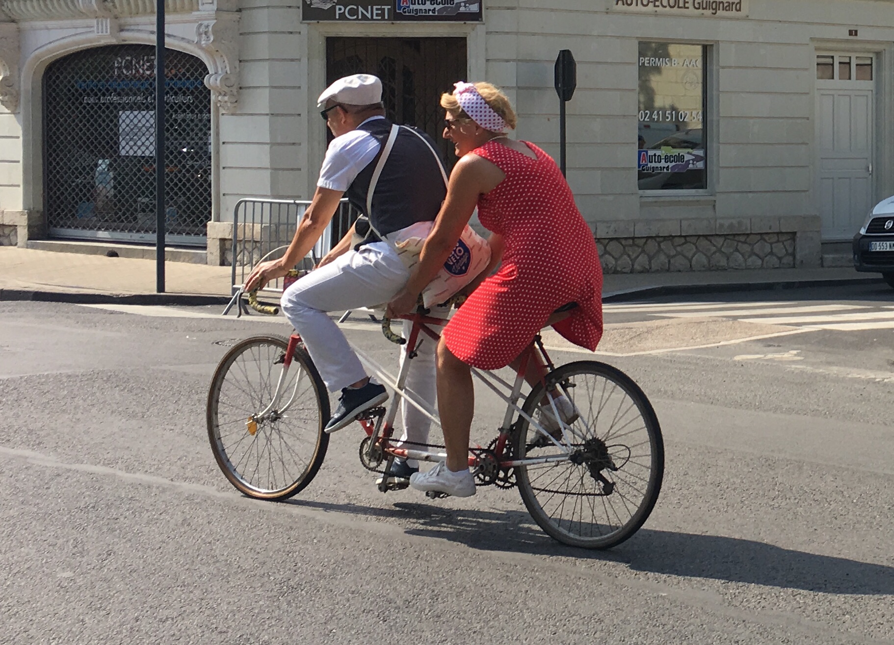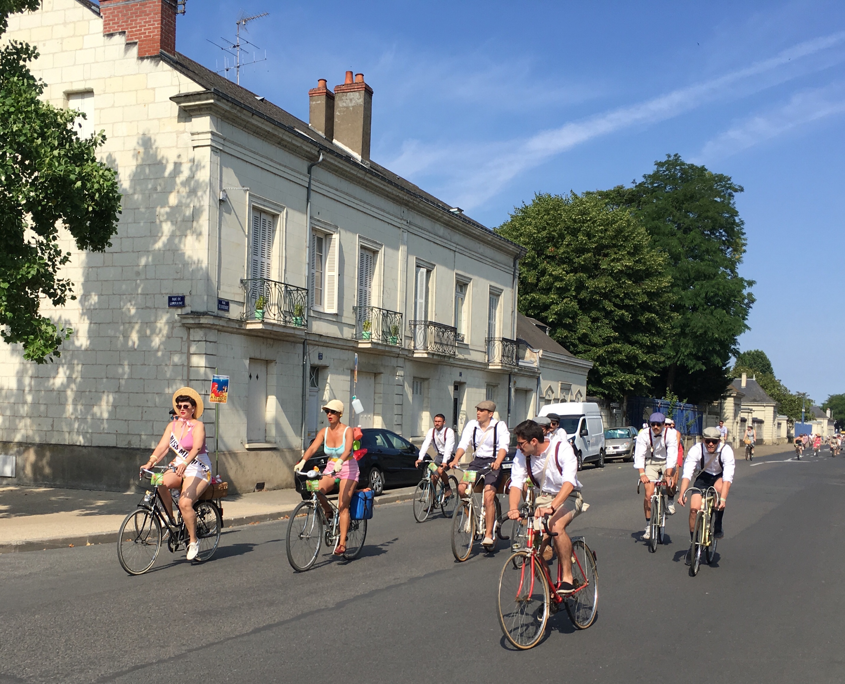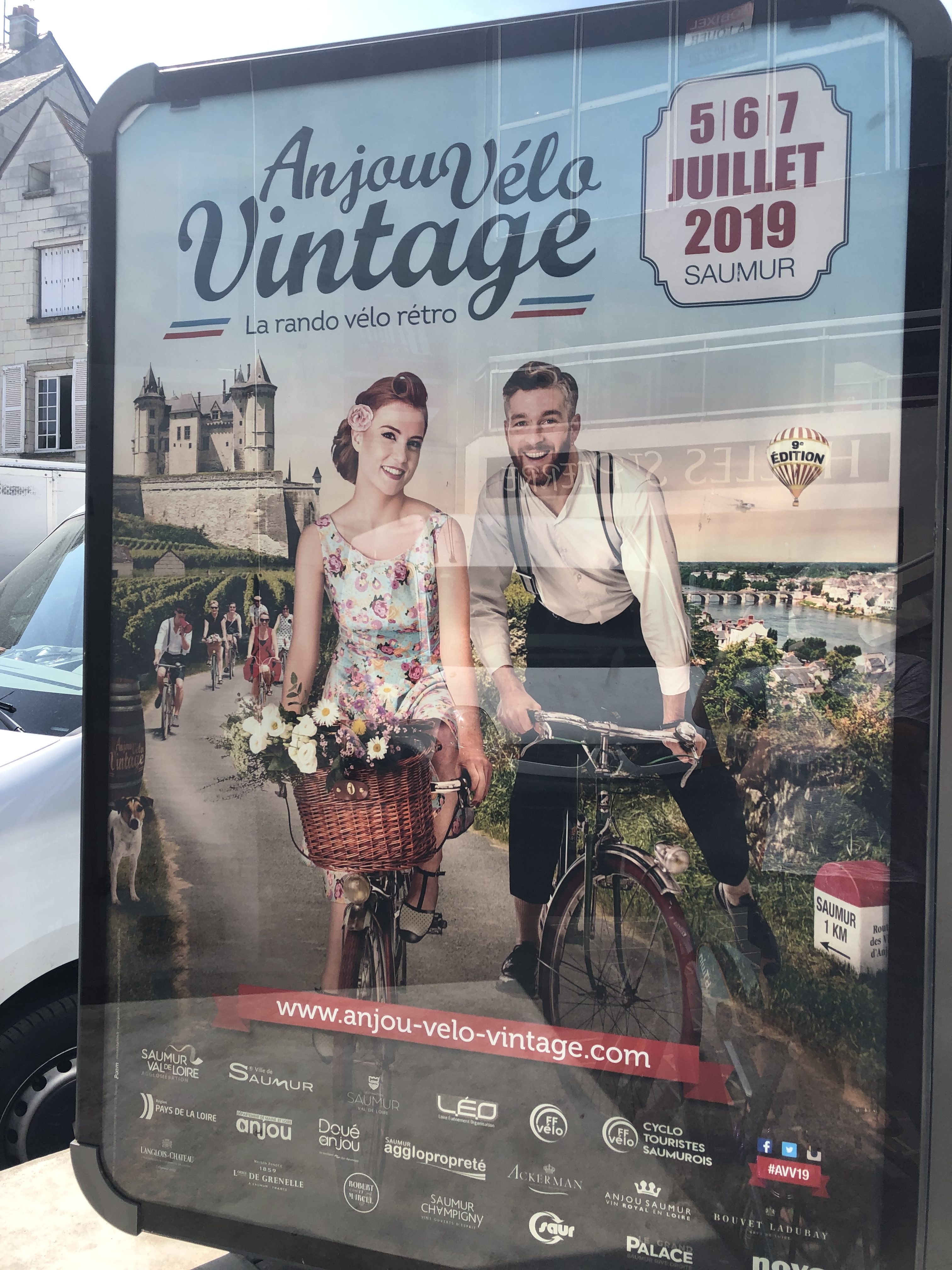 Our day of rest started with a slight disappointment – Saumur’s Petit Train was not running. We soon found out why, as we walked through the streets towards the path up to the château – the town was absolutely mobbed, and lots of people were dressed in clothes straight from the 1940s, pushing ancient-looking bicycles. There were men in braces, grandad shirts and flat caps, and ladies in flouncy polka dot dresses with their hair in complicated shiny rolls, or else held back with a brightly coloured bandeau. It was a ‘Vintage Vélo’ festival!