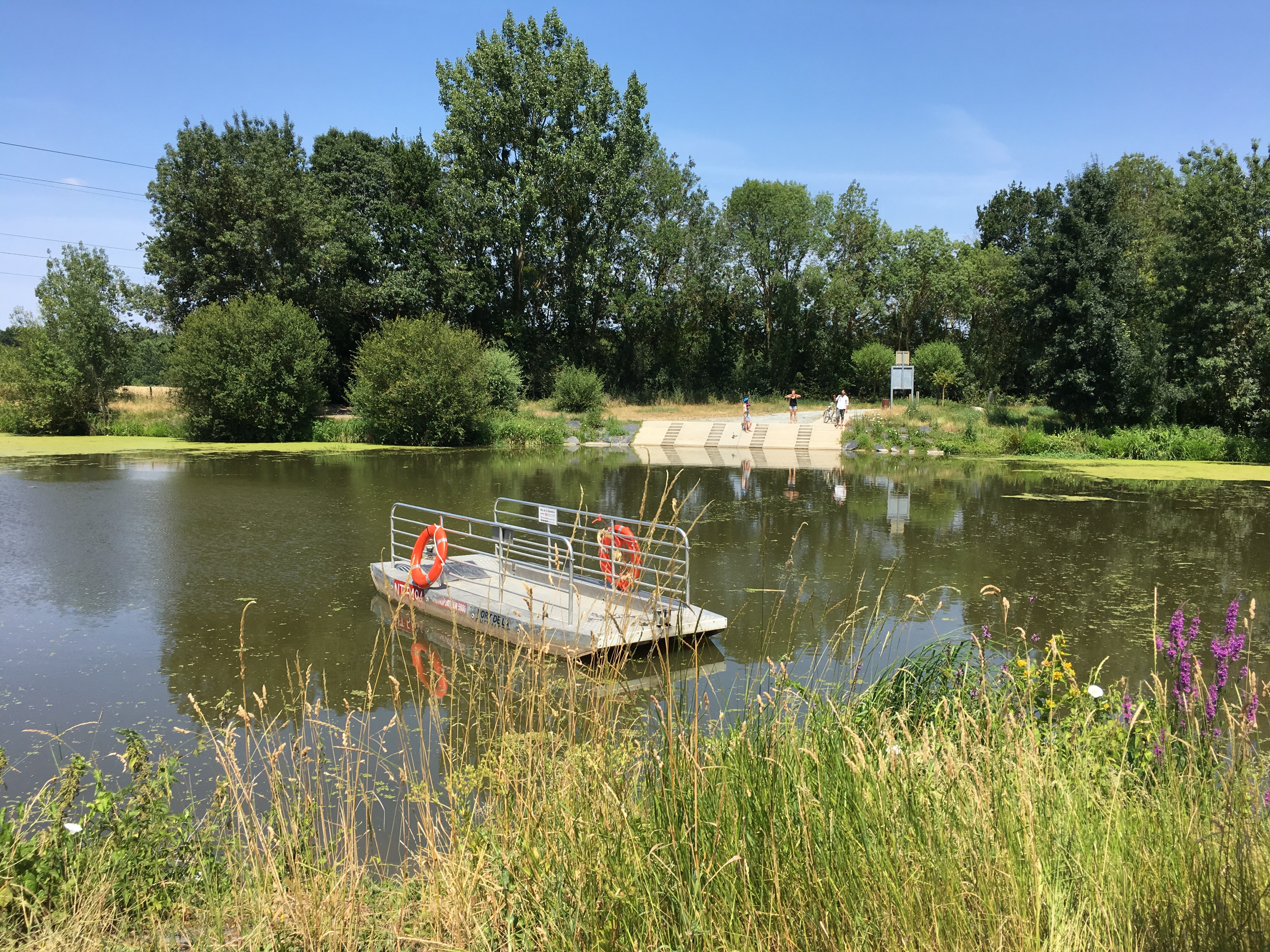 This looked problematic. There were instructions as to how to work around by a nearby road bridge if the ferry was not operating, and we were just about to set off to do that when a French family arrived at the opposite bank and hailed us. We waved that we were ‘going around’ and then they started hauling the little boat to their side of the water. Aha! A self-service chain ferry!