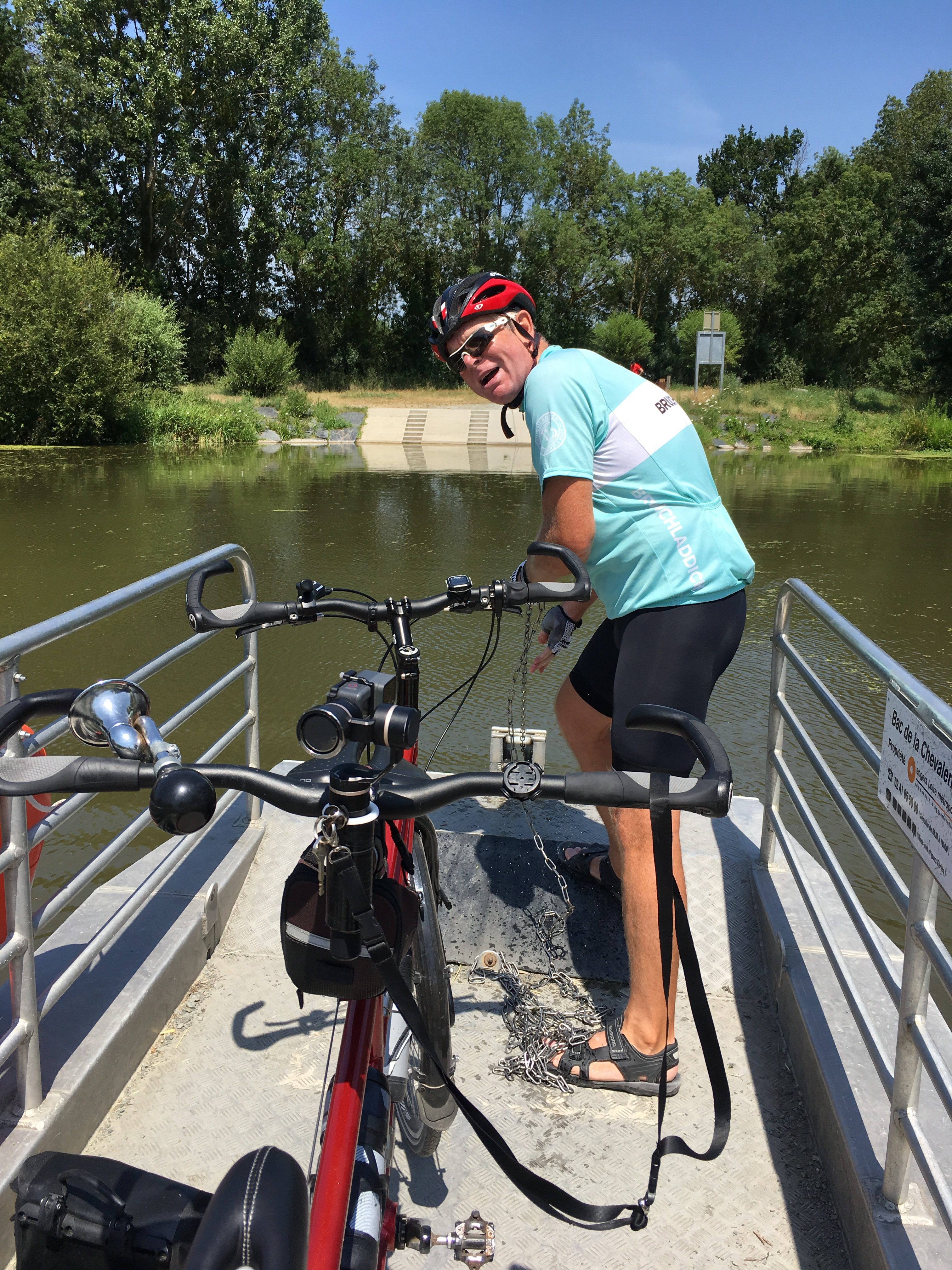 After they’d arrived at our side we loaded the tandem on, plus all our bags and ourselves, and the Captain manfully hauled us across.