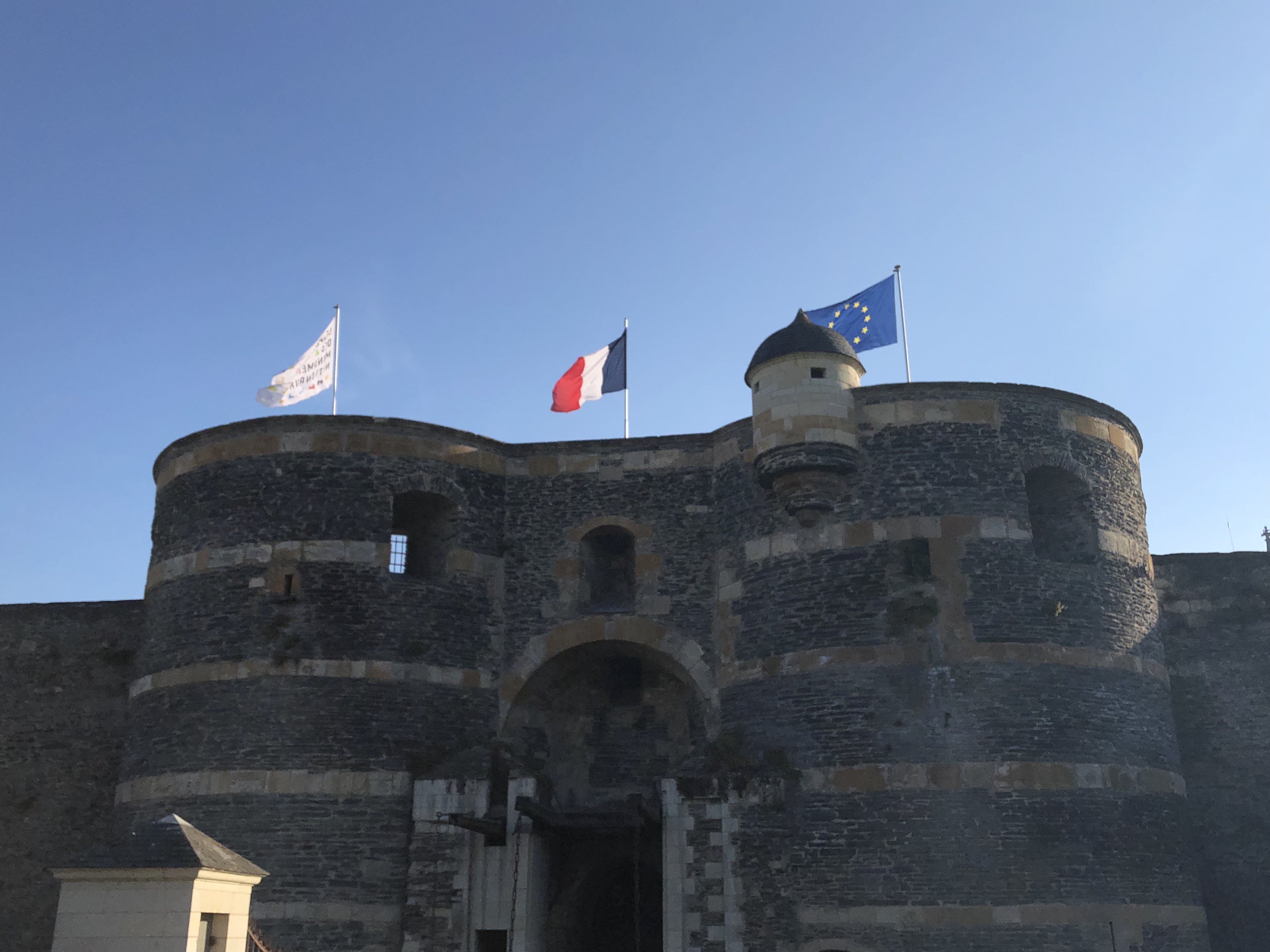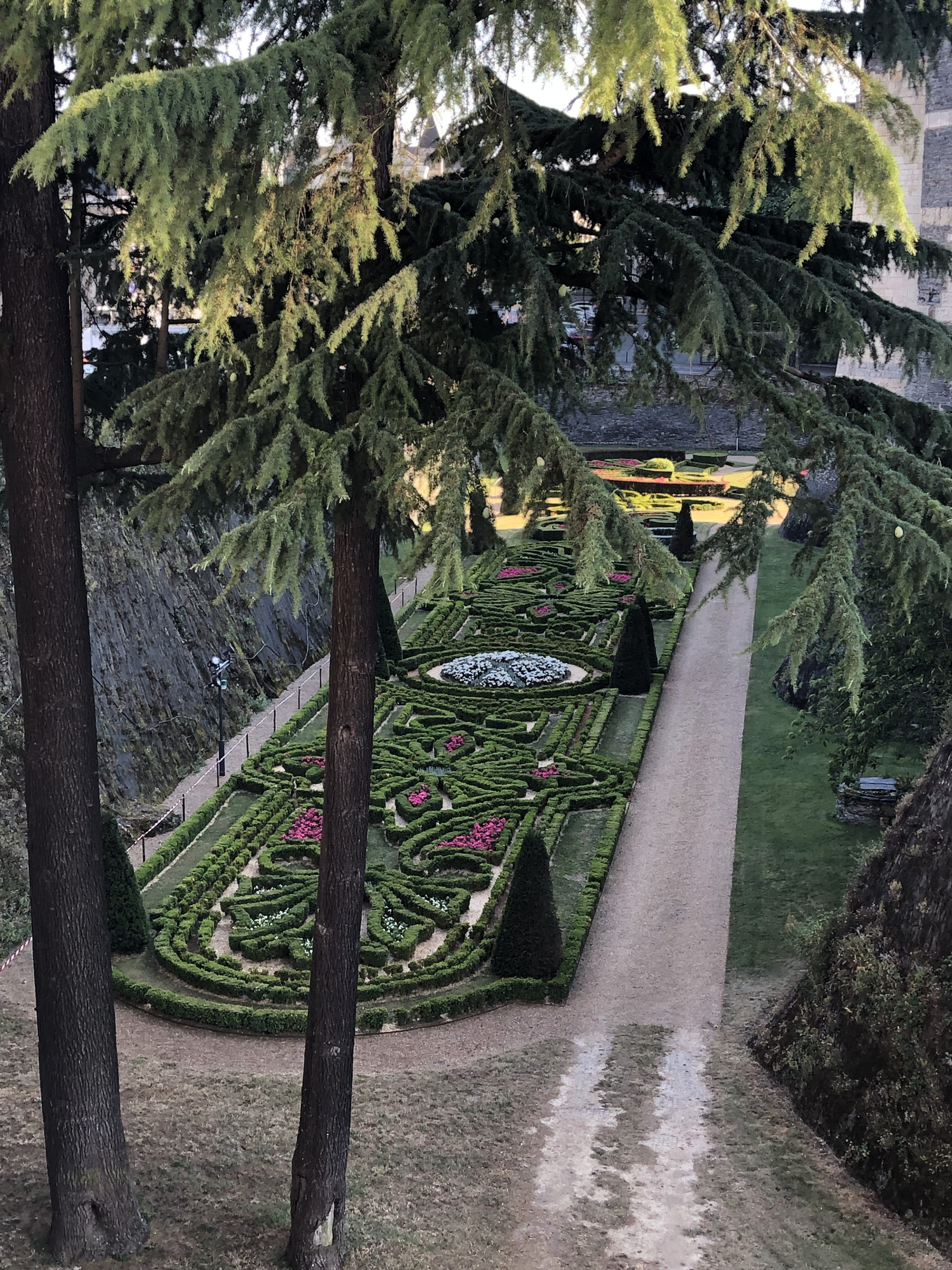 The Château d’Angers is not of the fairy-tale persuasion, unlike most of those we have already seen. It’s a massive, muscular, dominant building which looks as though it would have been impenetrable to attack when first built. It’s darker too, because of the use of the local slate in its construction, and surrounding it is a deep (now waterless) moat, which hosts some imaginatively designed knot gardens. We walked up to where a high terrace enabled us to see both the château close up and a sweeping view of the Maine below us.