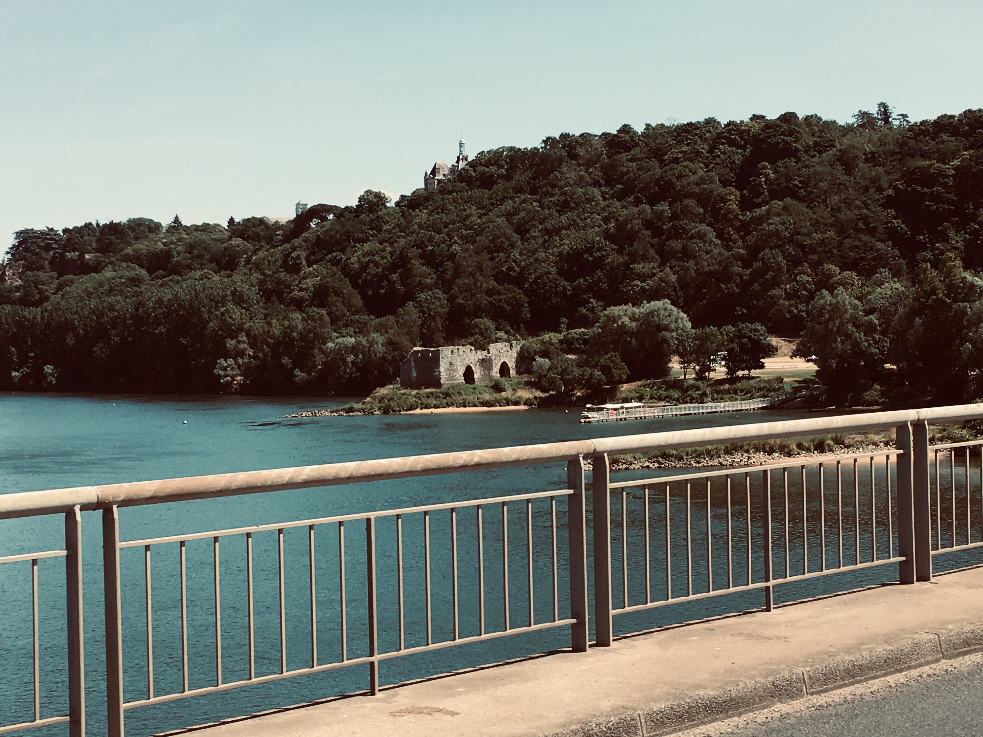 We lunched inside a busy restaurant in the town square. It wasn’t brilliant, but the Captain had faux-filet and salad, and the Stoker managed two boules of chocolate ice-cream. A nearby parapet proved to be an excellent viewpoint down towards the river, and after we’d spent some time admiring that we set off with about twenty-five kilometres remaining.
